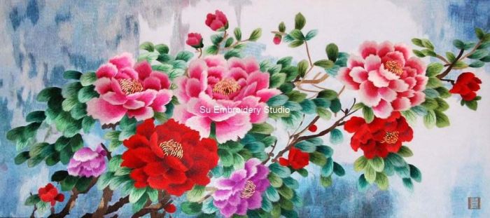 Now, let's explore four exquisite peony silk embroideries crafted by Su Embroidery Studio: