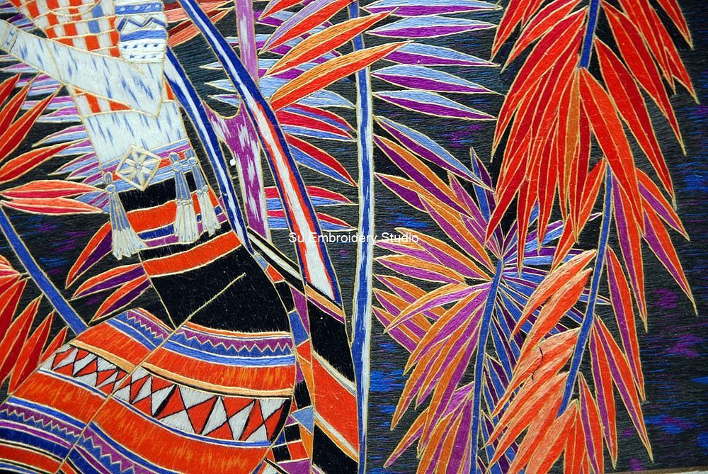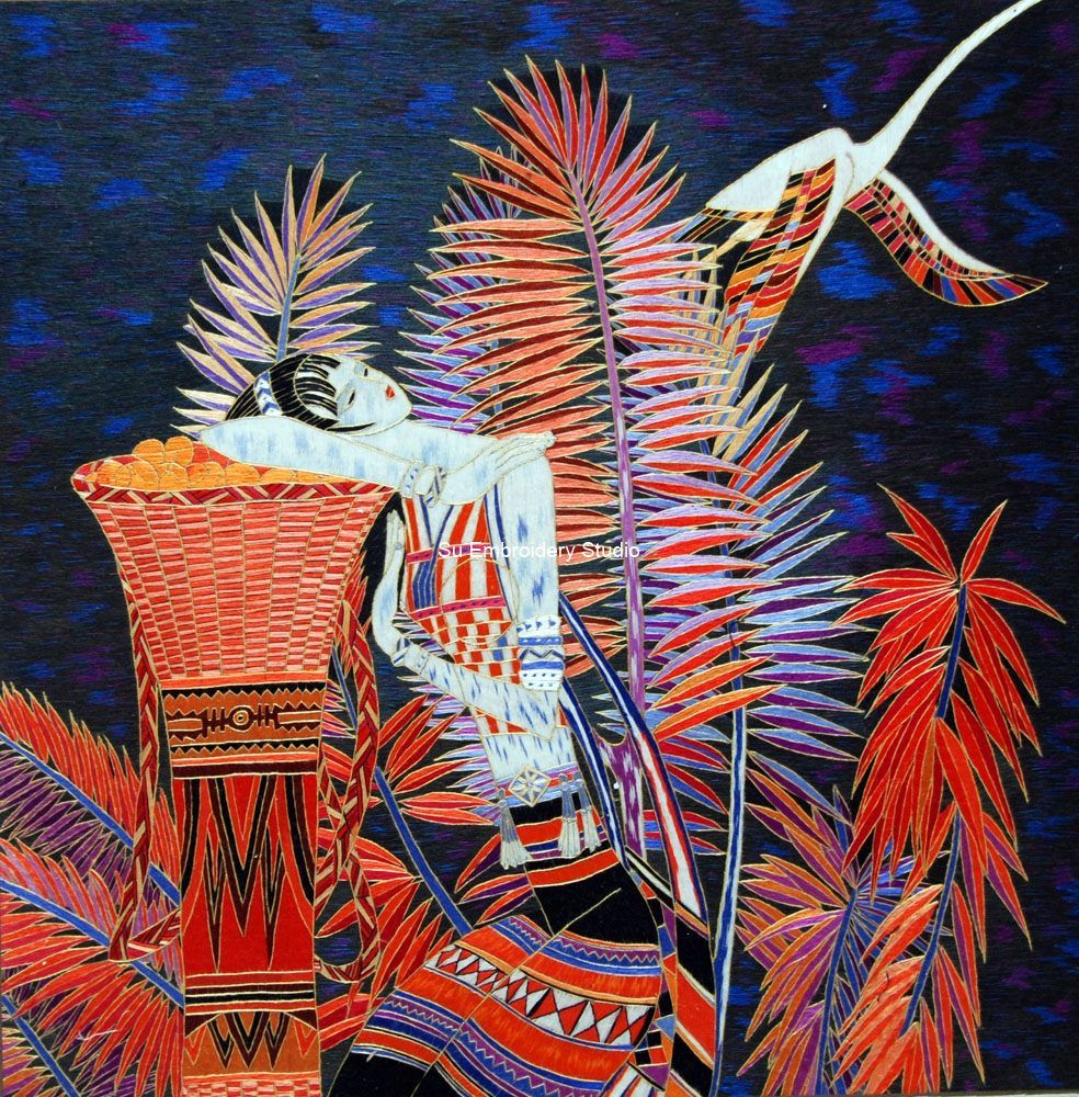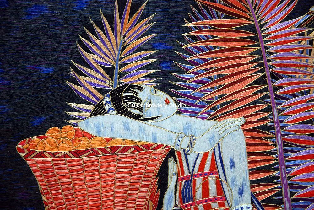 This abstract silk embroidery painting is a vibrant and intricate piece of silk art. It features a femail figure resting on an ornate, patterned basket amidst a backdrop of colorful, stylized palm leaves against a dark, textured background. The central focus is on the figure that appears to be in repose. The figure is adorned in clothing with complex patterns and textures. Surrounding the figure are stylized palm leaves that are rendered in bright reds, oranges, and yellows with detailed linework. The background has a deep blue color with lighter blue textures giving it depth and contrast. The entire painting is hand embroidered, characterized by its rich colors, intricate designs, and the interplay between the detailed foreground elements and the more subdued background.