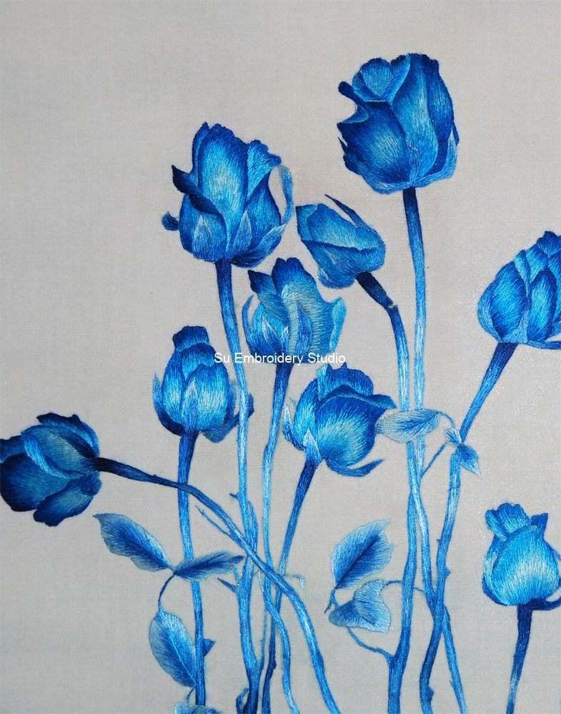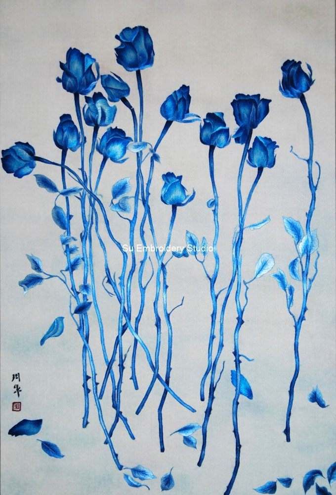 This silk embroidery painting is not only a celebration of the natural allure of blue roses but also a testament to the skill and artistry of traditional Chinese embroidery It stands as a perfect addition for collectors of fine art, as well as for those who appreciate the timeless elegance and captivating beauty that silk embroidery can bring to the realm of visual arts.