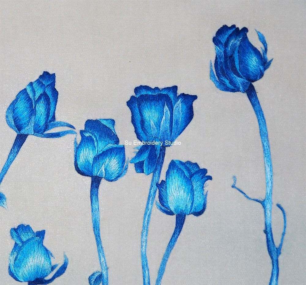 Each petal, leaf, and stem is hand embroidered with precision, highlighting the fine details and intricacies of the roses. The deep shades of blue are enhanced by subtle variations in tone, adding a sense of depth and dimension to each flower. The slender stems and delicate leaves intertwine gracefully, creating a harmonious composition that captures the viewer’s attention with its artistic beauty.