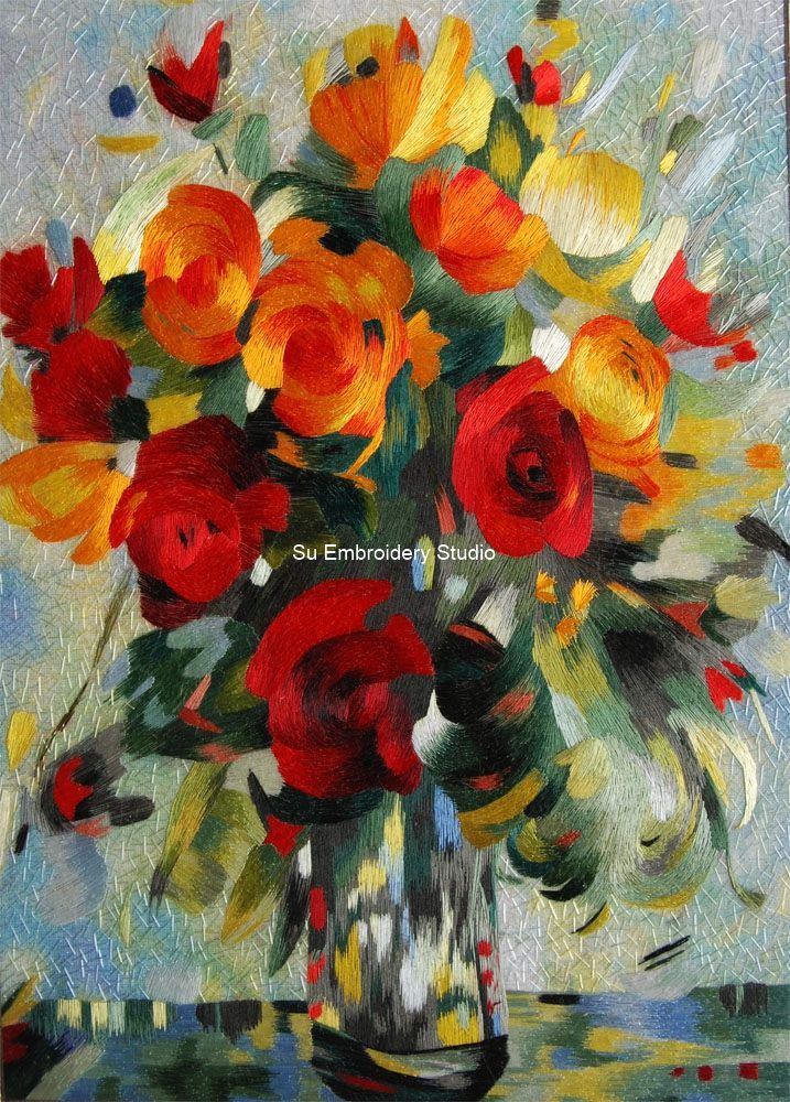 This is a vibrant silk embroidery painting featuring a bouquet of flowers in full bloom. The artwork is rich in color, with red, orange, and yellow flowers standing out against a textured background. The stitches create a dynamic and tactile surface that brings the blossoms and foliage to life. It’s an exquisite piece that combines the traditional art of silk embroidery with the timeless beauty of floral arrangements.