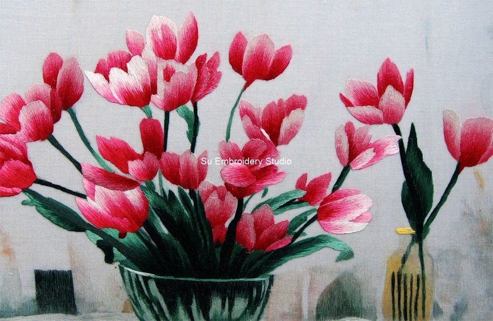 This vibrant silk embroidery portrays a detailed painting of a bouquet of red and pink tulips. The flowers are in full bloom, showcasing open petals that are meticulously hand embroidered with intricate detail. Each flower and leaf is a testament to the artist's skill, capturing the natural beauty of the tulips.