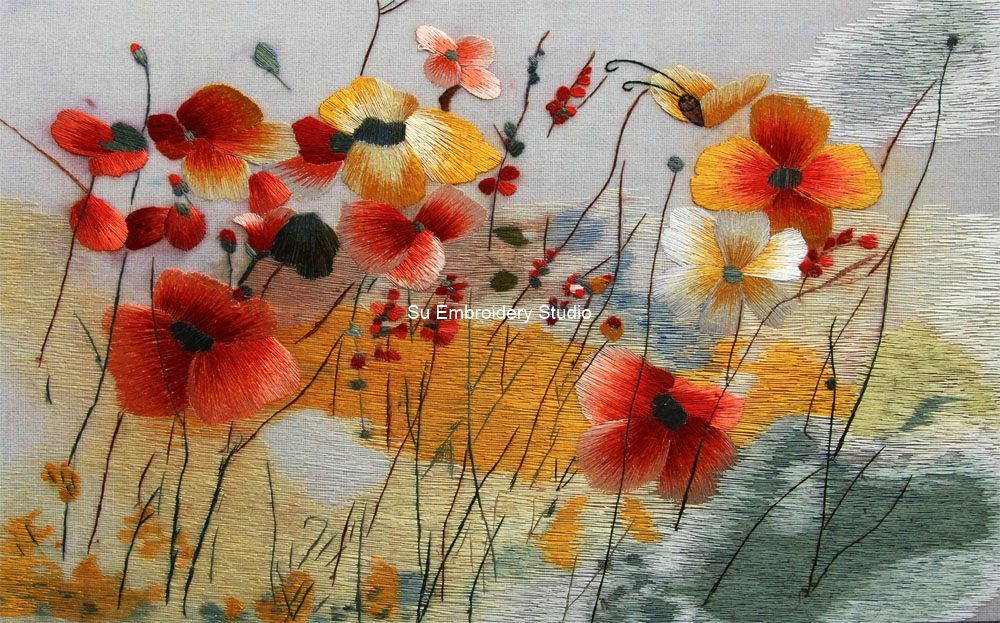 This silk embroidery artwork depicts a beautiful and colorful illustration of flowers, handembroidered on a silk fabric. The artwork features various types of flowers, predominantly in shades of red, orange, and yellow. The flowers are intricately detailed, with visible petals and stems. There are small buds and blossoms scattered throughout the image, adding to the diversity and richness of the floral display. The background is muted with soft tones that allow the vibrant colors of the flowers to stand out prominently. It gives off a serene yet lively vibe due to the combination of calm background tones and vibrant floral colors.