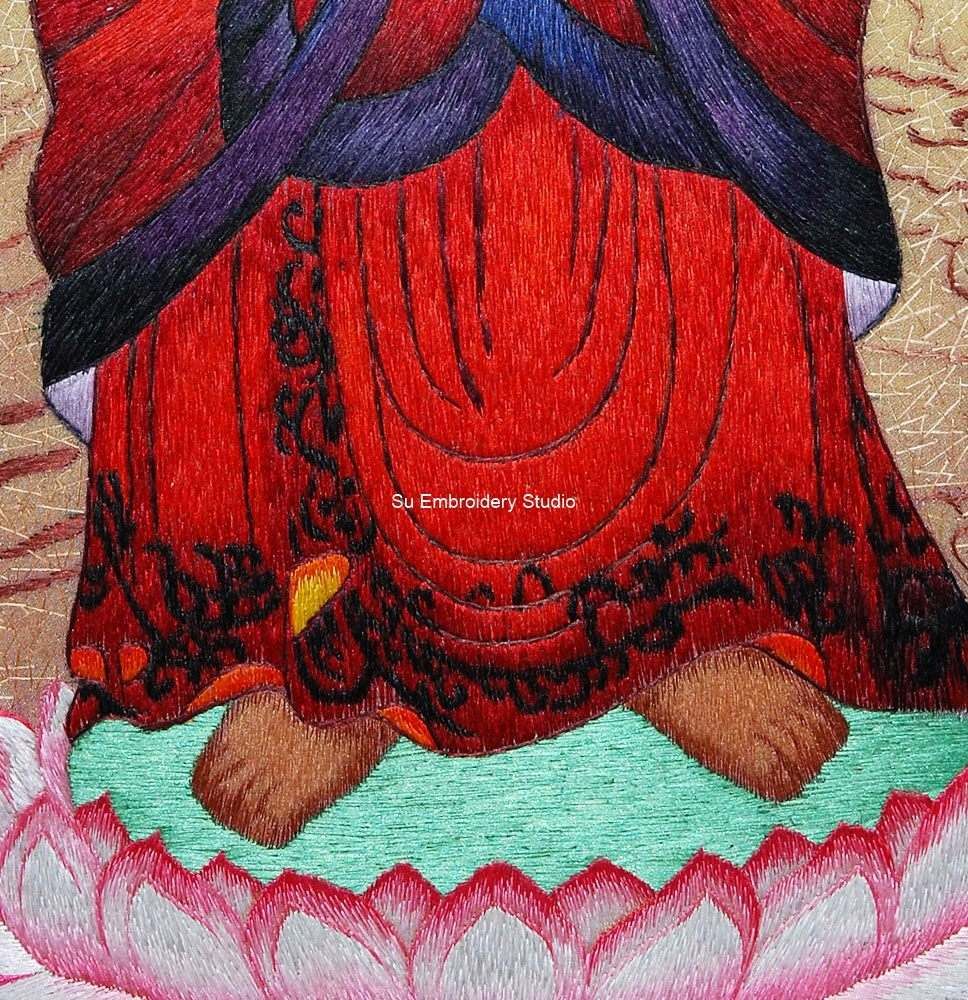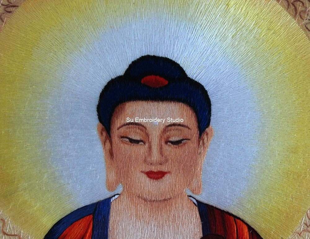 In summary, this Chinese silk art is a testament to the skillful craftsmanship and artistry of the embroiderer, capturing the spiritual presence and grace of Bhaisajyaguru Buddha in a visually stunning and culturally rich representation.