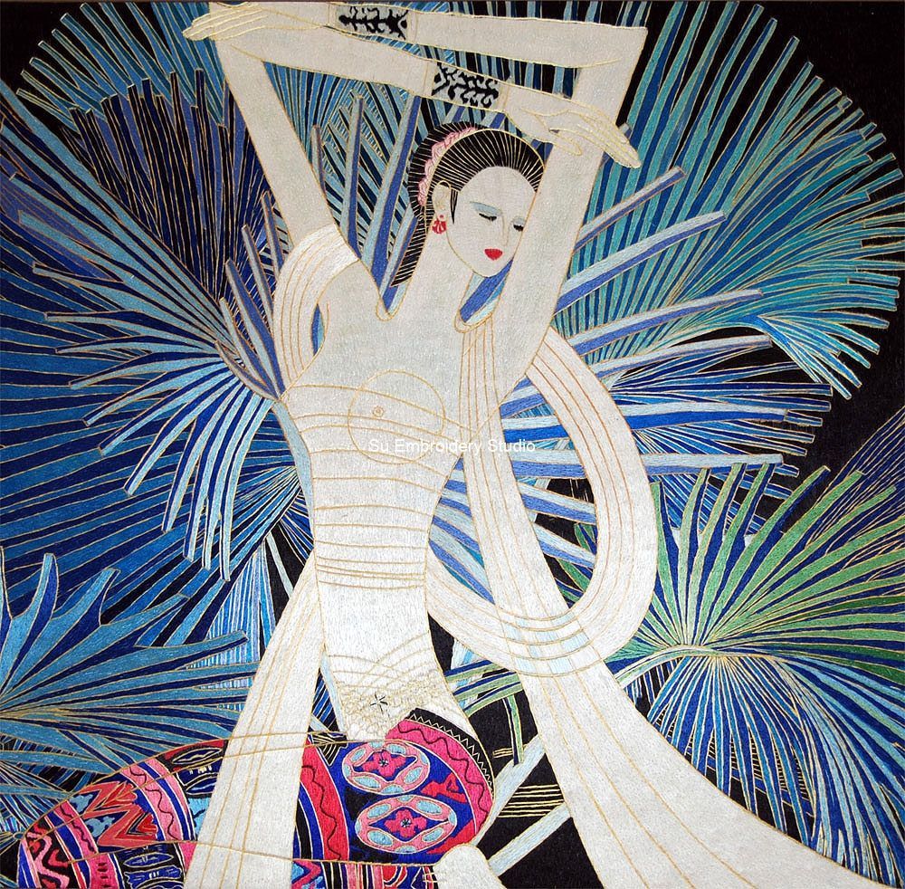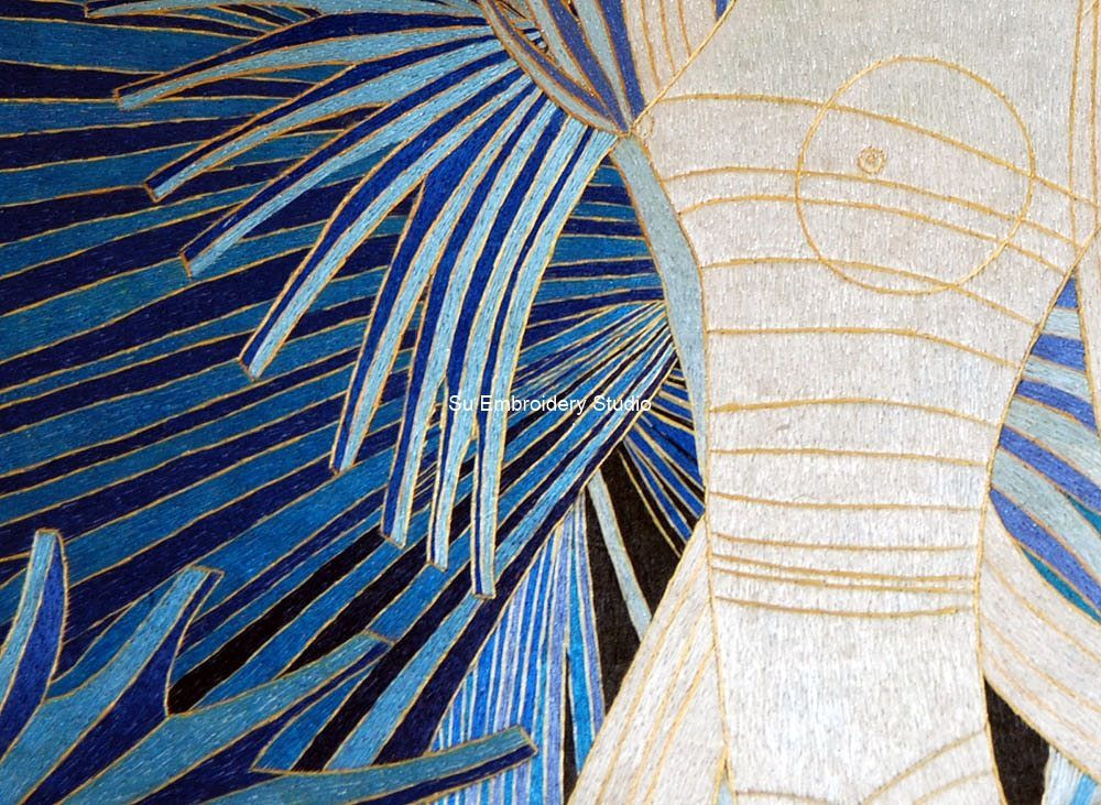 This silk embroidery painting depicts an abstract girl in a graceful pose amidst vibrant, blue palm leaves. The girl is adorned in traditional attire and accessories. The central focus of the image is a girl, posed with one arm raised and the other extended to the side. The girl wears a long, flowing white garment with intricate detailing and patterns. A colorful, patterned fabric piece is visible beneath the white garment. The background features large, vibrant blue palm leaves that create a contrasting backdrop to the lighter-colored figure. The embroidery painting is fully hand embroidered. It showcases intricate stitching techniques to create detailed textures and patterns on both the figure and background elements.