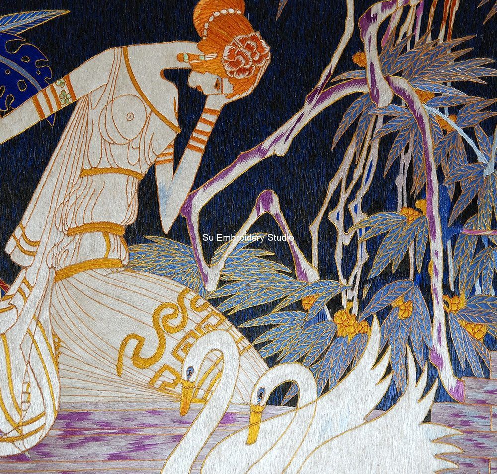 The swans, masterfully embroidered with white and gold threads, exudes a calm and graceful presence. The meticulous stitching captures the fluidity of the swan's feathers, adding a touch of realism to the artistic representation.