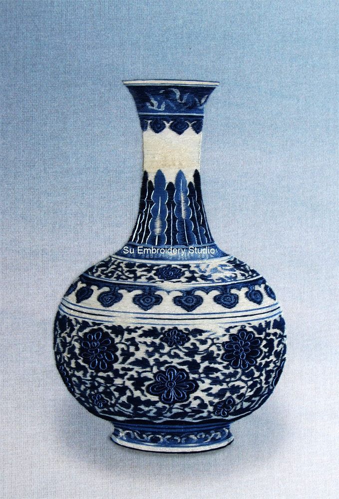 This silk embroidery painting depicts a classic, elegant porcelain vase featuring intricate blue and white patterns. The vase has a round body and a long, slender neck, adorned with detailed designs that include floral motifs, leaves, and decorative borders. It exudes an antique charm reminiscent of traditional Chinese porcelain artistry.