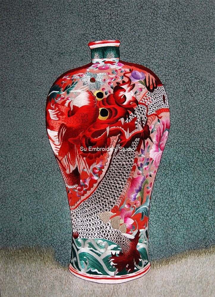 This Chinese silk embroidery is a marvel of intricate design, featuring a splendid portrayal of a Chinese porcelain vase adorned with a majestic red dragon. The composition is a visual symphony of colors and meticulous details that bring the scene to life.