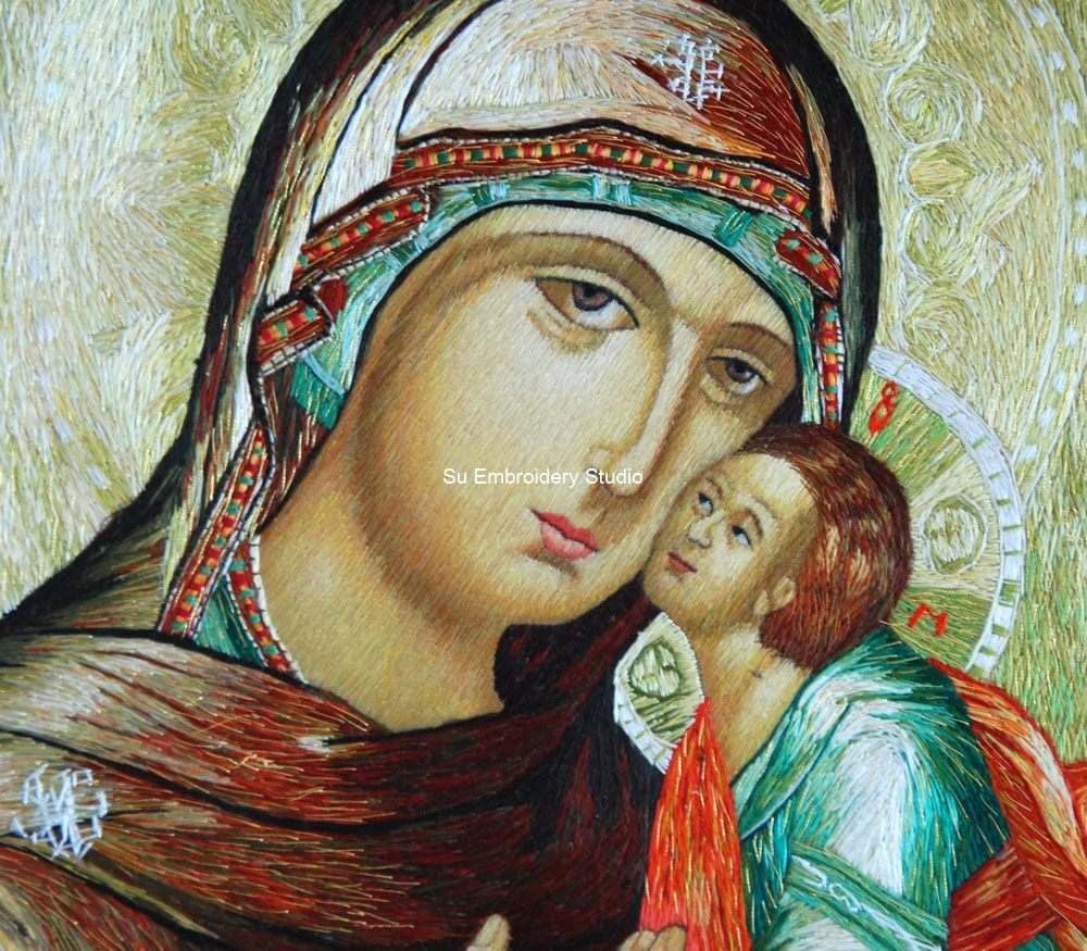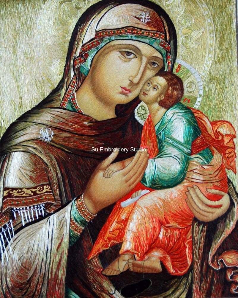 This silk embroidered artwork depicts the iconic scene of the Mother of God with a child. Both the mother and the child are wearing intricate and vibrant clothing with intricate details finely hand embroidered with silk threads. The mother's clothing is adorned with detailed designs and patterns, showcasing multiple colors and textures. The child is wrapped in bright red and green clothing, making them a focal point against the mother's darker attire. Both figures are set against an ornate background featuring swirling patterns and designs that add depth to the scene. It is a perfect combination of Western oil painting and Chinese silk embroidery.