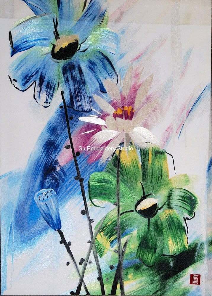 This silk embroidery painting is a radiant and lively artwork celebrates the beauty of blooming flowers. The embroidery artwork is a captivating blend of vibrant colors, with a predominant palette of blue, green, and white, creating an ethereal and visually enchanting experience.
