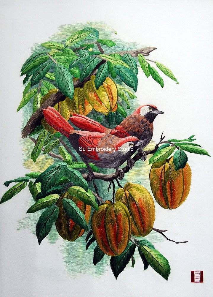 This Chinese silk embroidery depicts two birds perched on a branch amidst lush green leaves and hanging star fruits. The birds have a distinct coloration, with white faces, black bodies, and red wings and tails, all intricately hand embroidered. They appear to be observing their surroundings attentively. The leaves are detailed with various shades of green silk threads, indicating light and shadow effects. The fruits are yellowish-green with hints of red, appearing ripe and succulent.