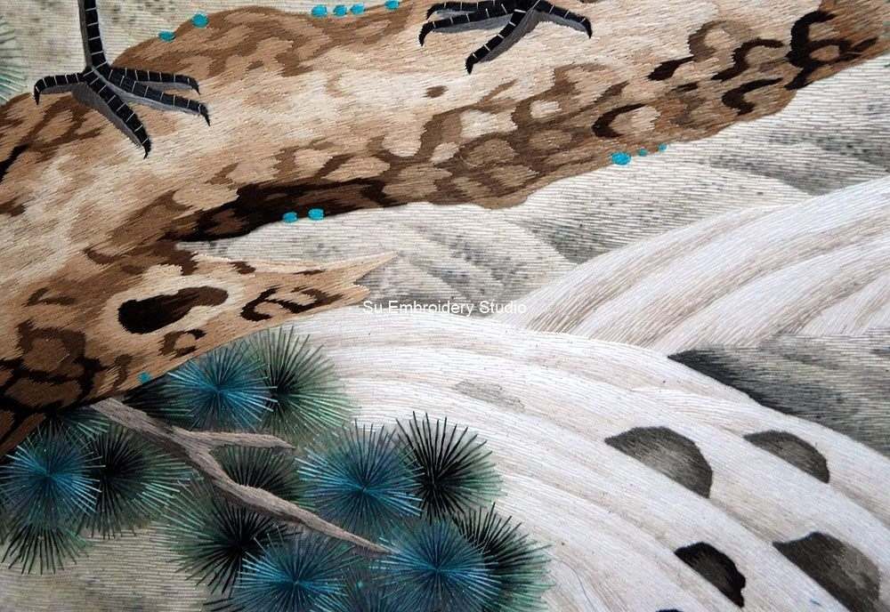 The pine tree branch, also adorned with fine silk threads, exhibits a realistic texture and color gradient that adds to the overall authenticity of the embroidery artwork. Every stitch contributes to the lifelike depiction of the branch, showcasing the embroidery artist's skill in creating detailed and textured surfaces.