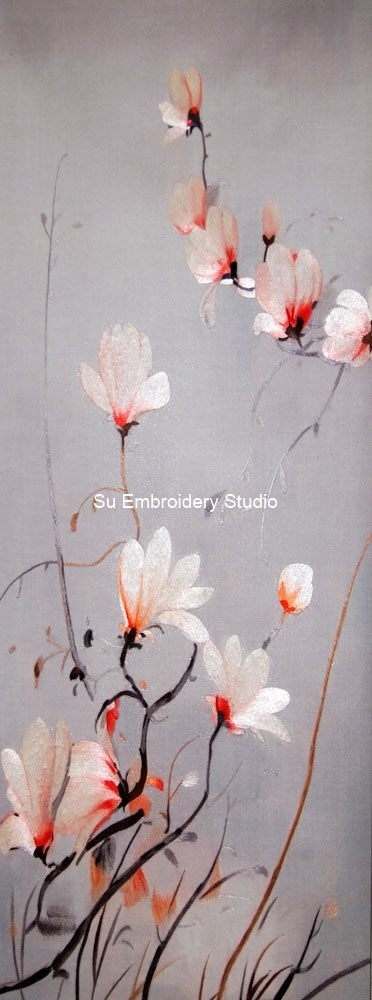 Graceful branches, expertly rendered in thin brown threads, elegantly stretch across the canvas, adorned with small buds and leaves that add a touch of natural elegance to the composition. The background, in a muted grey tone, serves as a sophisticated backdrop, allowing the vivid colors of the flowers and branches to take center stage. Each stitch in the silk embroidery contributes to the detailed texture and depth of the blossoms and branches, a testament to the skill and craftsmanship involved in its creation.