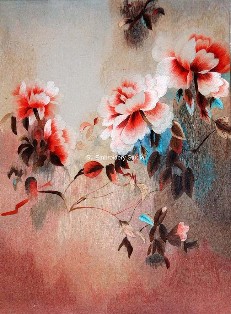 This Chinese silk embroidery features delicate, intricate stitches creating a vivid depiction of blooming peony flowers and lush foliage. The hand embroidered artwork showcases a blend of rich colors, with prominent red and white flowers standing out against a softly gradient background transitioning from beige to deep red. The leaves are intricately hand embroidered, showcasing the embroidery artist’s skill in rendering lifelike botanical elements.