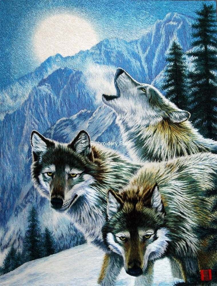 This silk embroidery painting stands as a breathtaking work of silk art, skillfully capturing the untamed beauty of nature. The hand embroidered scene unfolds in a snowy mountainous landscape, where three wolves are depicted under the enchanting glow of a full moon, creating an atmosphere of mystique and wonder.