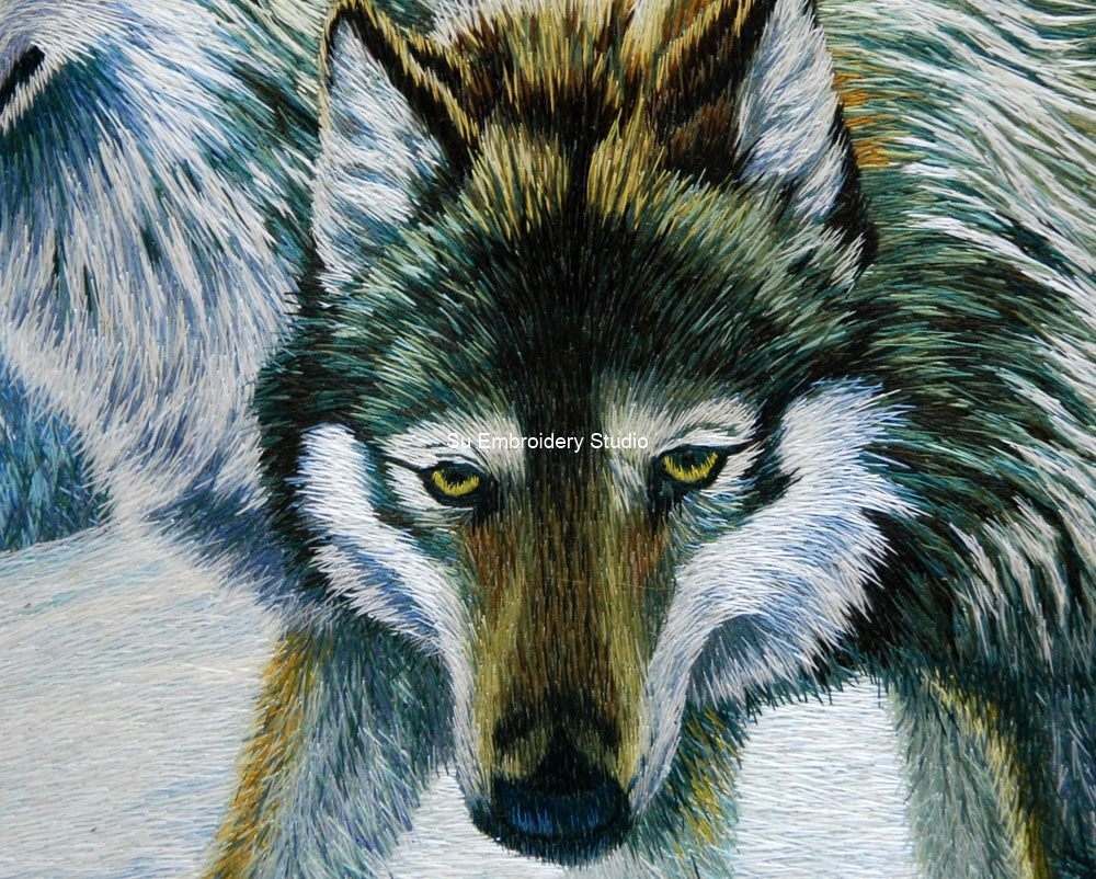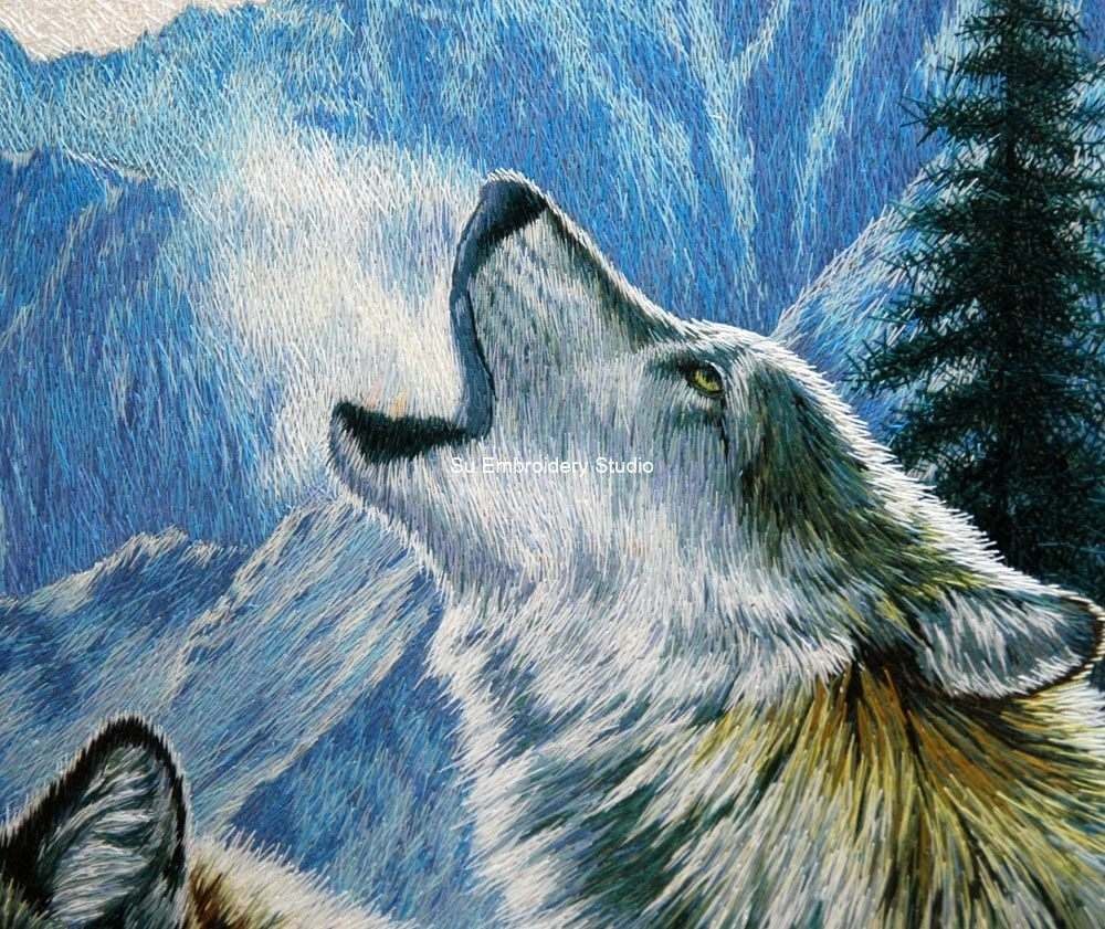 The wolves are meticulously hand-embroidered with vivid detail, their fur brought to life through meticulous stitches that convey both texture and movement. One wolf, head raised in a haunting howl, appears to connect with the luminous moon above, while the other two exhibit intense expressions, their eyes reflecting the celestial light. These details not only showcase the technical prowess of the artist but also infuse the composition with a sense of wild grace and untamed energy.