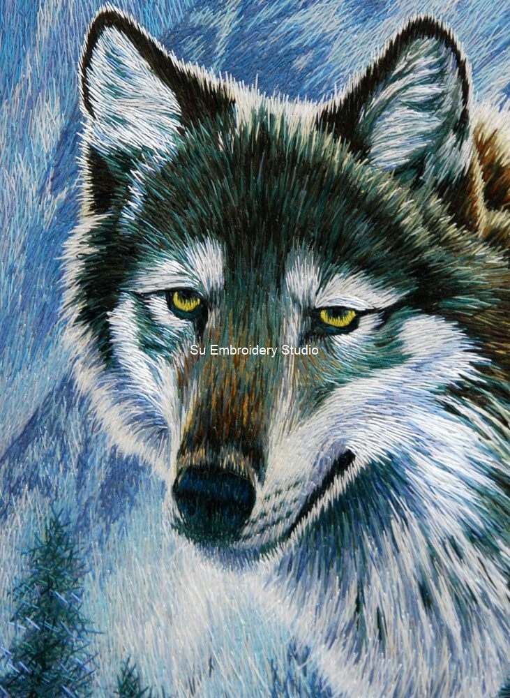 This silk embroidery painting is a stunning work of silk art that captures the essence of nature’s wild beauty with wild animals. The embroidered painting features three wolves in a snowy mountainous landscape, with a full moon casting its glow on the snow-capped peaks and creating an enchanting atmosphere. The wolves are hand embroidered in vivid detail, with their fur rendered using meticulous stitches that convey both texture and movement. One wolf, with its head raised high, appears to be howling at the moon, while the other two exhibit intense expressions, their eyes reflecting the moon’s light and adding an element of mystique to the composition. Pine trees stand tall against the majestic mountains, their dark silhouettes contrasting beautifully with the blue hues of the sky and snow. Thw whole embroidery painting is hand embroidered, including its background. This piece is a testament to masterful silk embroidery artistry, encapsulating nature’s wild beauty and evoking emotions of awe and reverence.