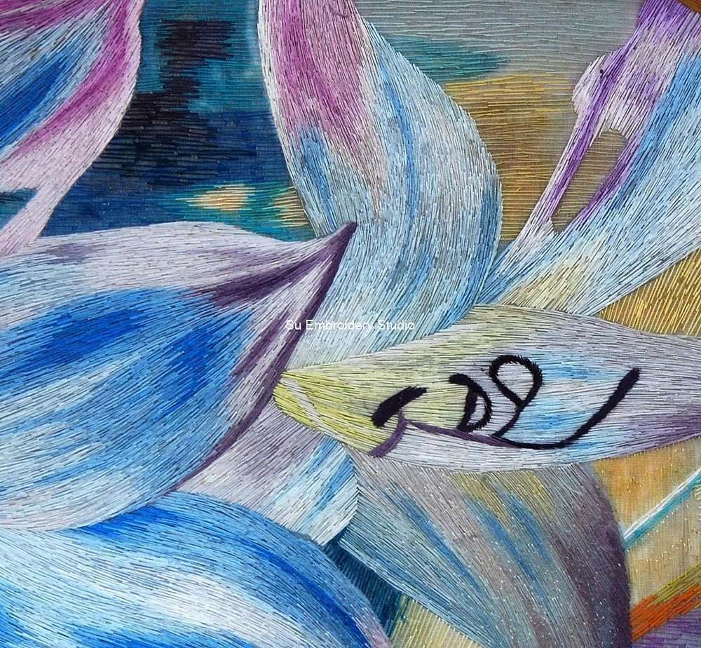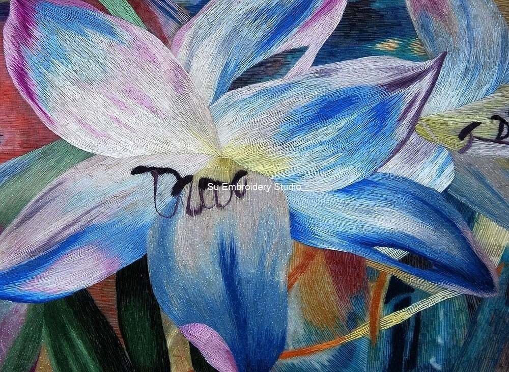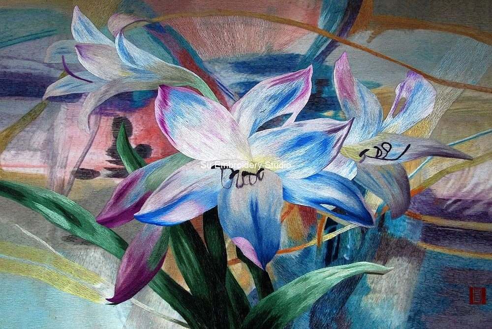 This Chinese silk embroidery showcases a vibrant and intricate depiction of blooming lilies, a popular subject in art symbolizing purity and renewal. The embroidery artwork is rich in texture and color, featuring delicate stitches that bring the flowers to life with hues of white, blue, and purple. The background is an abstract mix of pastel tones, adding depth and contrast to the floral foreground.