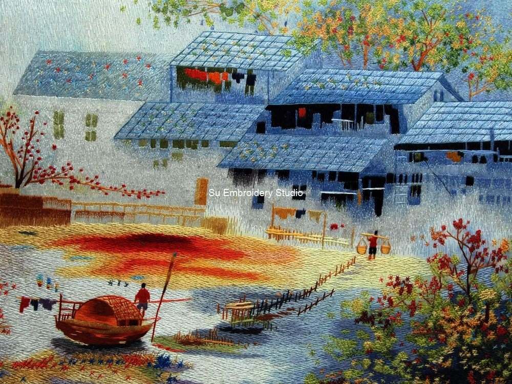 This silk embroidery painting is a serene depiction of a tranquil rural setting, capturing the essence of traditional architecture and the beauty of nature. Crafted with meticulous embroidery, each element is intricately stitched to bring texture and depth to this captivating scene.