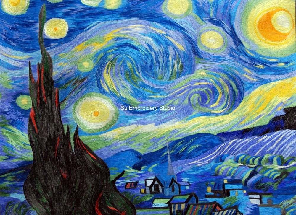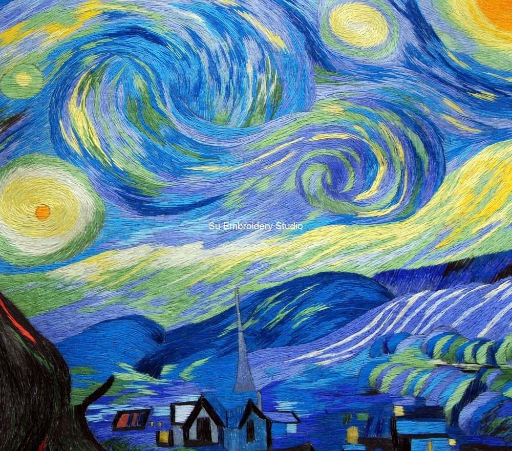 This silk embroidery artwork is a captivating and textured rendition of Van Gogh’s masterpiece, ‘Starry Night.’ The embroidery artist skillfully translates the iconic painting into a vibrant tapestry of color and texture, using intricate stitches to bring each element to life.