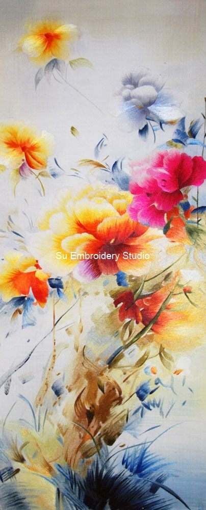 This Chinese silk embroidery features a vibrant and colorful display of flowers and foliage. The intricate stitches create a detailed and realistic representation of the blossoms. It is a vertical silk embroidered painting showcasing various types of flowers in full bloom. There are yellow, pink, orange, and blue flowers, each with distinct shapes and petal designs. The flowers are surrounded by green leaves and stems, adding contrast to the bright colors of the blossoms. Some parts of the embroidery have lighter shades which give an illusion of sunlight filtering through the foliage. The background is made up of soft hues that allow the vibrant colors of the flowers to stand out prominently. The stitches are intricate and detailed, highlighting the texture and depth in each flower and leaf.