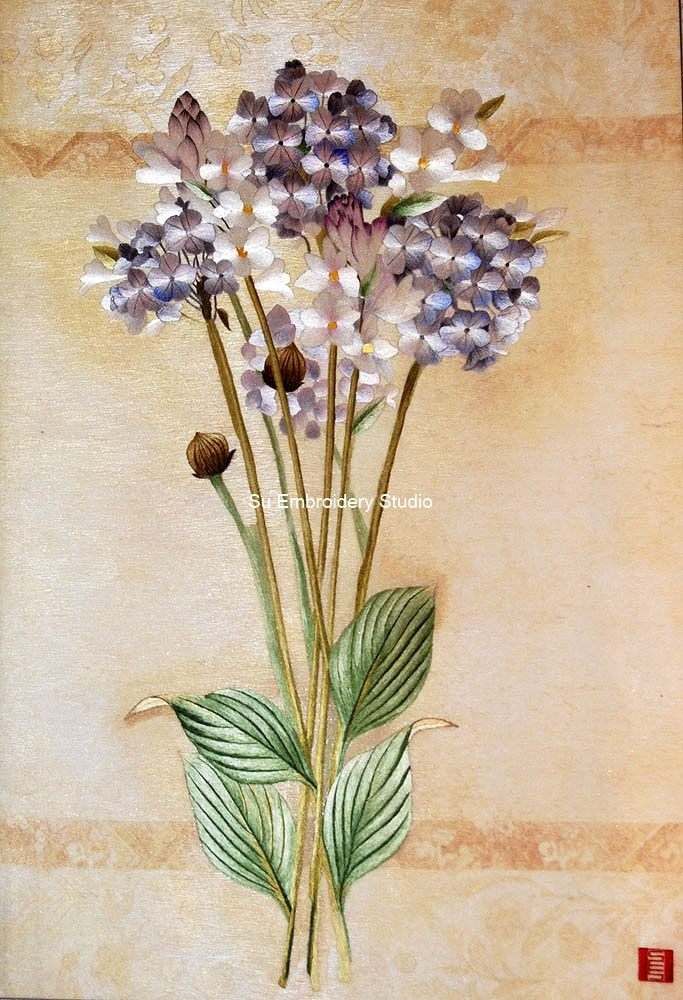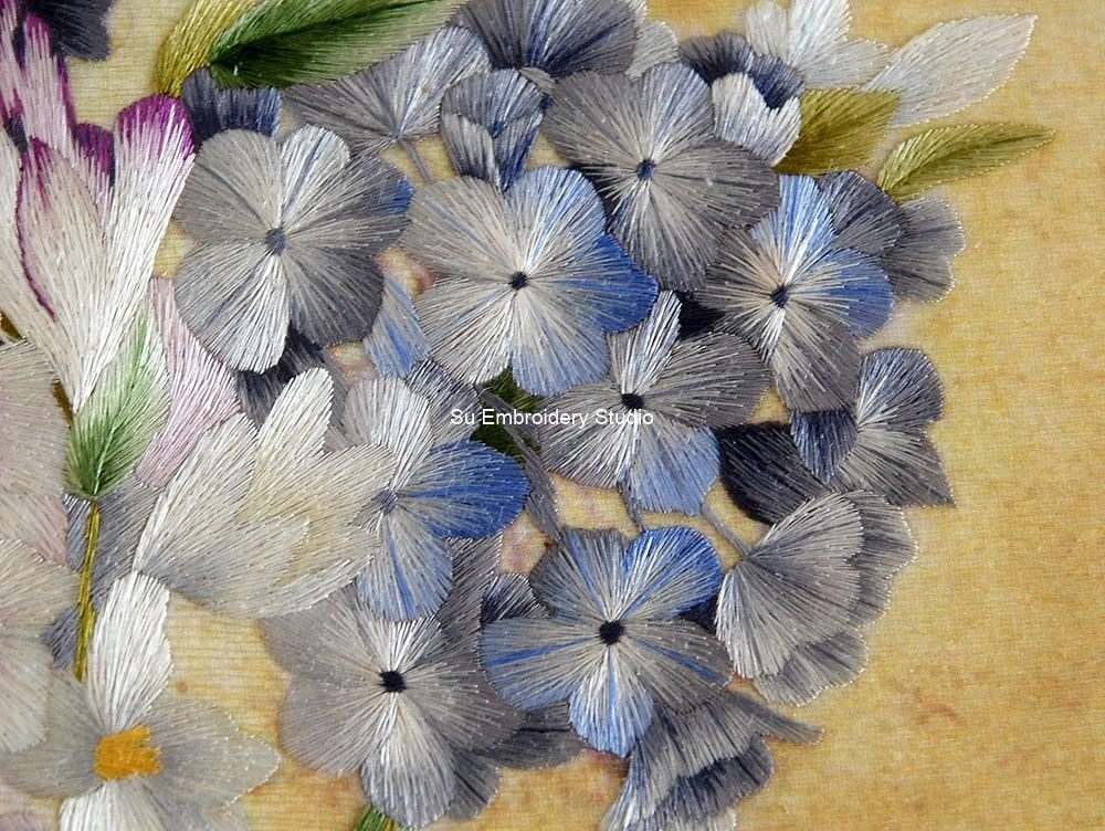 This silk embroidery painting is a testament to traditional craftsmanship, where every stitch is a brushstroke, and the overall composition is a harmonious blend of skill and artistry. The timeless beauty of hydrangea flowers is elegantly captured in this exquisite piece, making it a perfect addition to any collection.