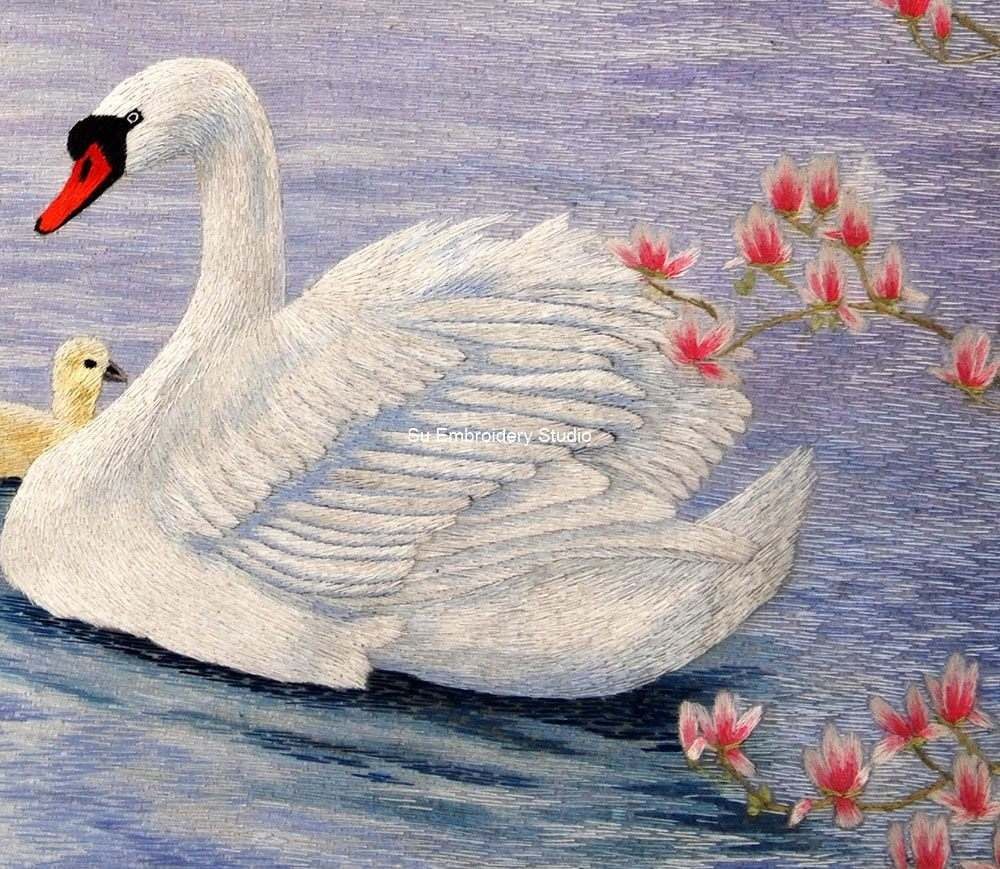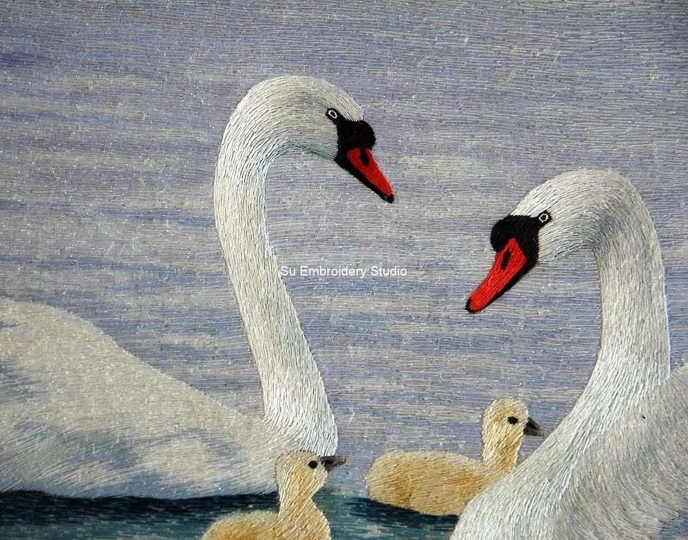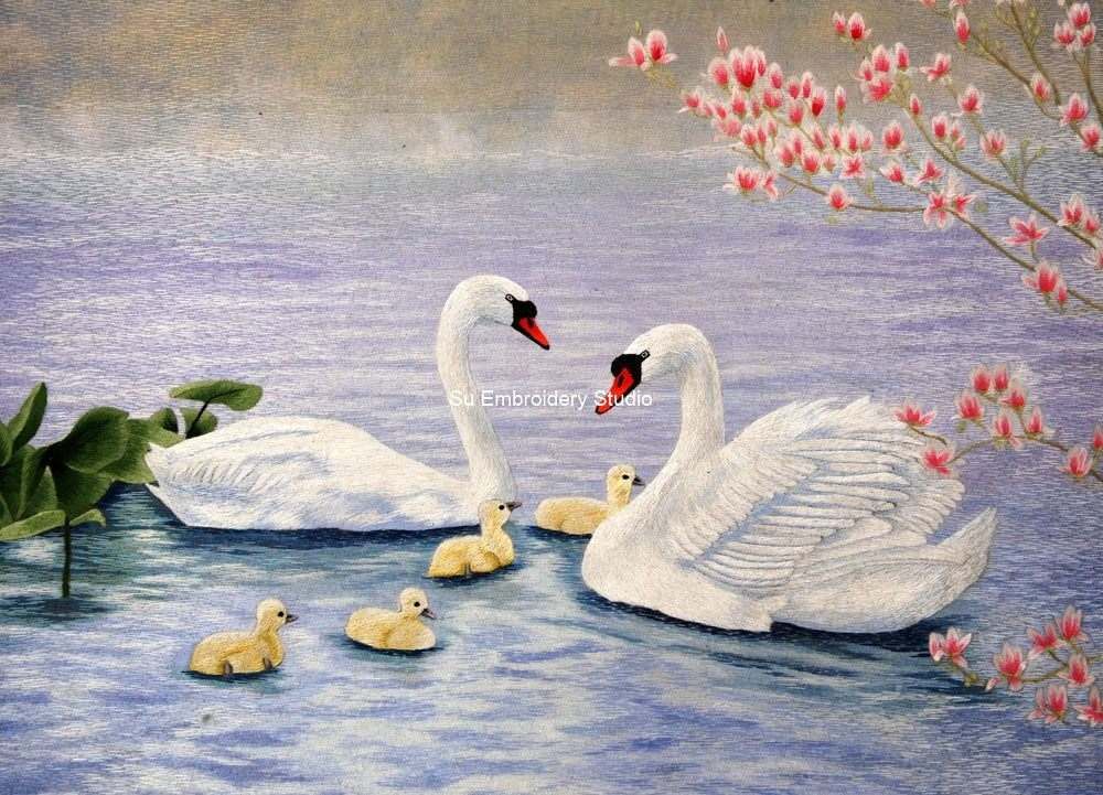 This exquisite piece of silk embroidery embodies the beauty of nature, skillfully bringing to life the peaceful coexistence of swans and their cygnets in a harmonious aquatic environment.