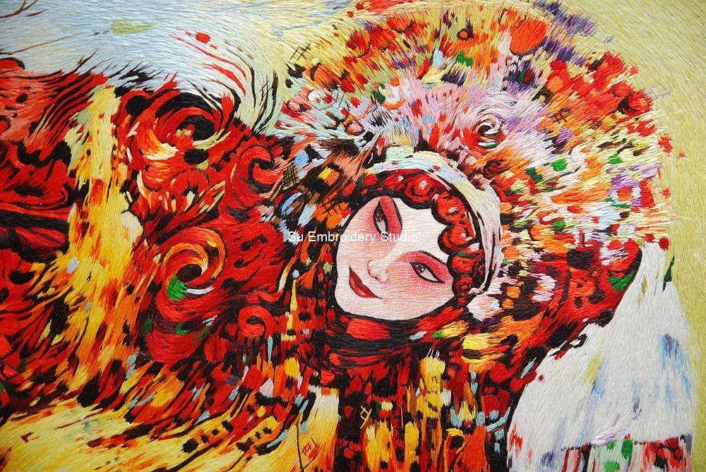This silk embroidery painting, reproduced from an oil painting, showcases a vibrant and dynamic scene, characterized by a blend of vivid colors and intricate detailing. The embroidered silk artwork captures the essence of a dancer adorned in an elaborate Peking Opera costume. The opera dancer played as Yang Guifei, a concubine of emperor Li Longji (Tang Xuanzong) in the Tang Dynasty. The background is filled with swirling colors that seem to radiate outwards from the central figure. Rich textures are visible due to the intricate stitches used to create detailed patterns and designs. A mix of warm and cool tones creates a visually striking contrast throughout the embroidery artwork. The silk art is fully hand embroidered, including the background.