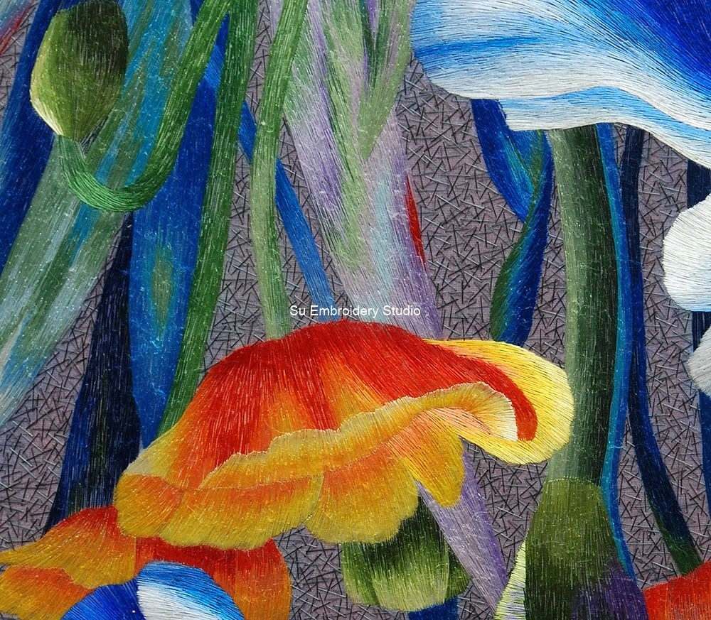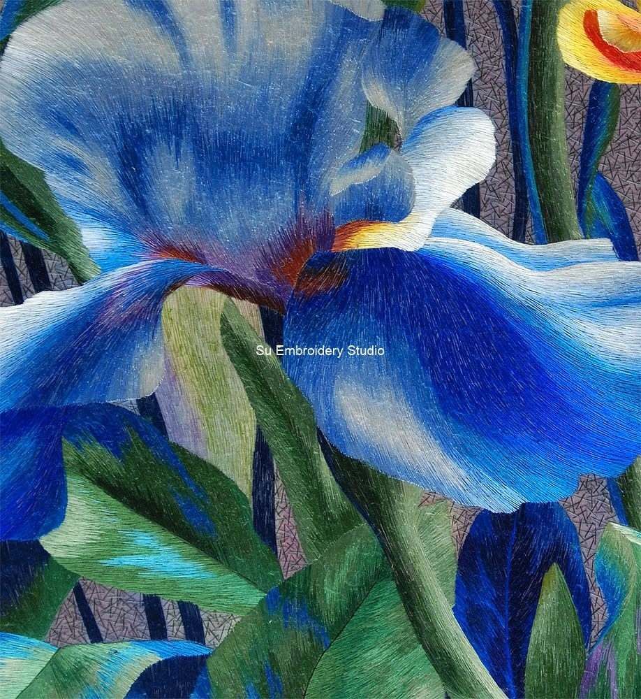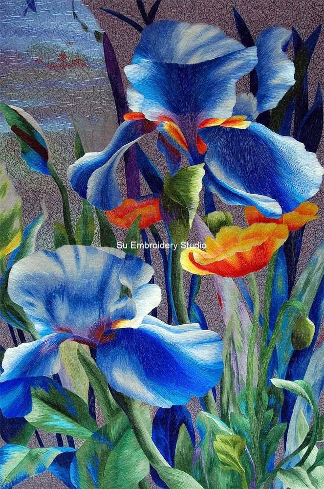 This silk embroidery painting features exquisite blue irises and poppy flowers. The embroidered silk artwork showcases intricate stitching techniques, rendering a lifelike portrayal of the flowers with an emphasis on the irises’ delicate petals and the poppy’s radiant color. The background texture, achieved through meticulous silk threading, adds depth and contrast, making the flowers stand out prominently.