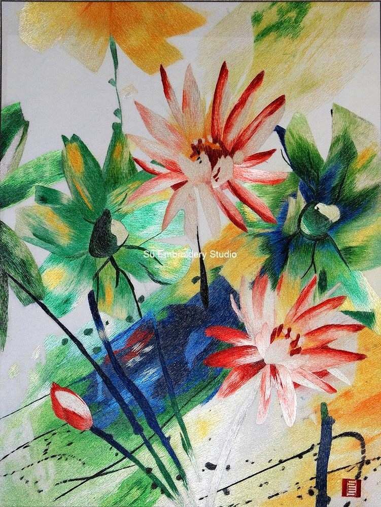 In summary, this silk embroidery painting is a testament to the embroidery artist's mastery, capturing the essence of a blooming floral spectacle with meticulous embroidery work, vibrant colors, and a harmonious background. It invites viewers to immerse themselves in the dynamic beauty and serene elegance of nature's bounty, while the artist's seal adds a personal and authentic touch to the composition.