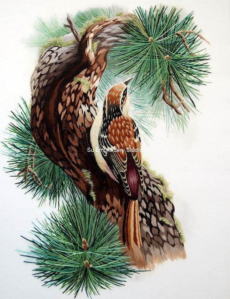 This detailed silk embroidery picture is a masterful showcase of traditional embroidery artistry, skillfully bringing to life the natural world through intricate stitching. The central focus of the embroidery artwork is a lifelike depiction of a bird perched on a textured tree branch, enveloped by vibrant green pine needles.