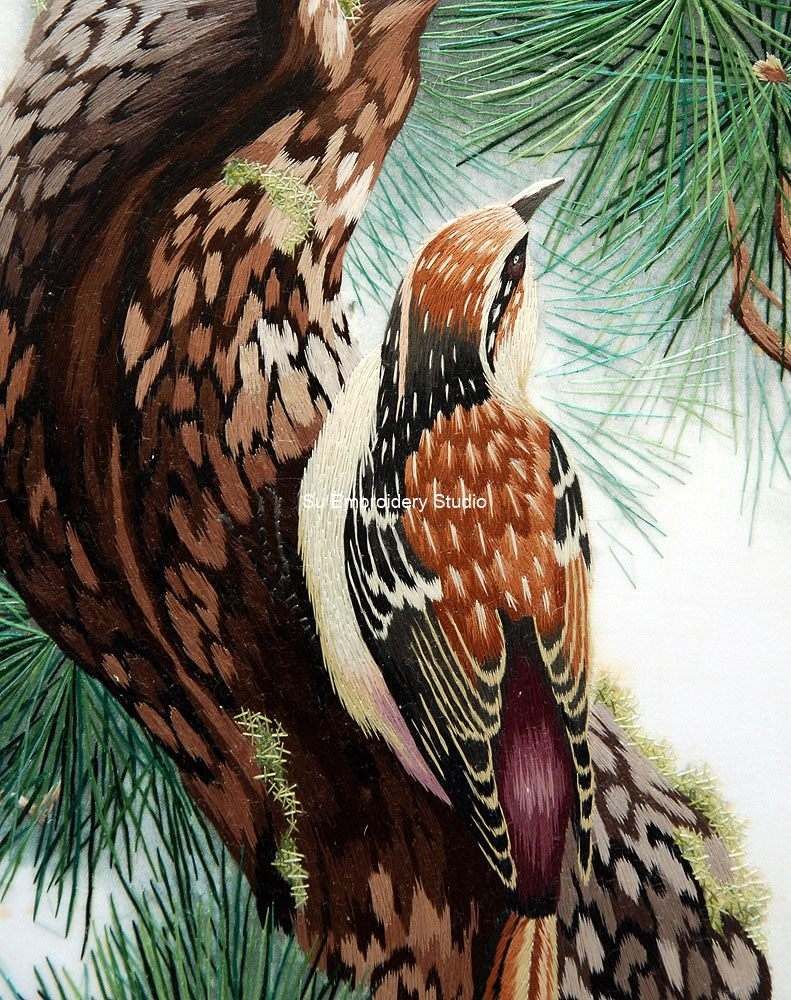 This is a detailed Chinese silk embroidery picture featuring a lifelike depiction of a bird perched on a textured pine tree branch, surrounded by vibrant green pine needles. The intricate silk stitching captures the bird’s detailed feather pattern, with shades of brown, white, and a touch of purple. The tree bark is skillfully hand embroidered to showcase its natural texture and color variations of brown. This silk embroidery artwork exemplifies traditional silk embroidery artistry, making it an exquisite piece for art collectors and nature enthusiasts.