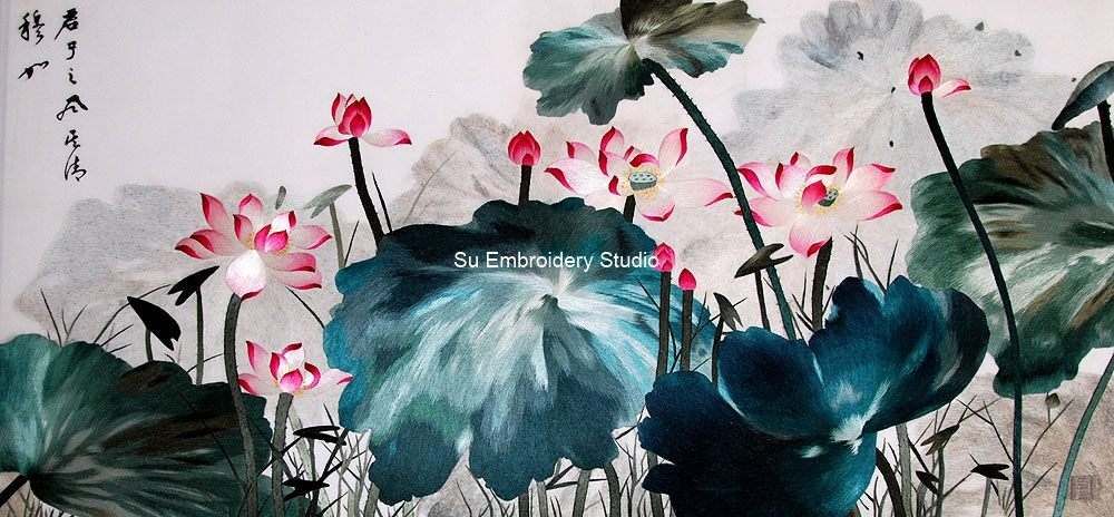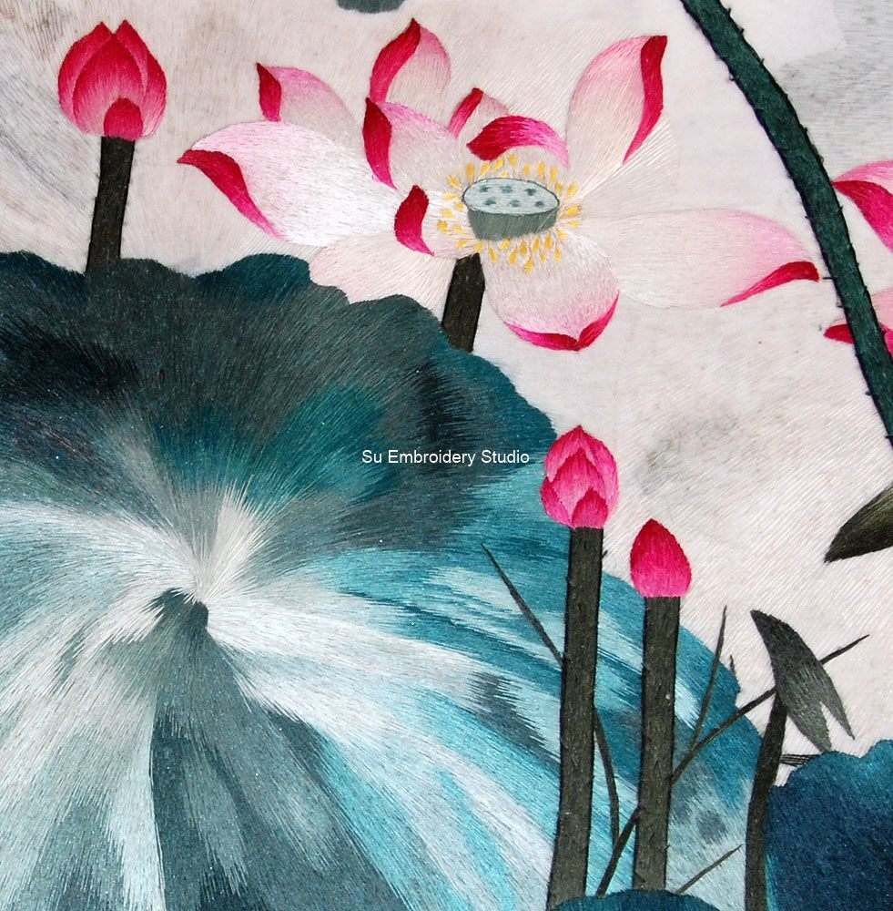 This is a beautiful Chinese embroidery painting of blooming lotus flowers amidst large green leaves. The embroidery artist has used a mix of vibrant and subtle colors to bring the scene to life. The pink petals of the lotus flowers are hand embroidered with delicate silk threads in short stitches, highlighting their elegance and grace. The green leaves, painted with varying shades of green and blue, provide a contrasting backdrop that accentuates the beauty of the flowers. There’s an interplay between light and shadow on both the flowers and leaves which adds depth to each element. In the background, there’s subtle shading that suggests water or sky but doesn’t detract from the main focus - which is on the lotuses. The embroidery painting is in traditional Chinese-style and features several pink lotus flowers at different stages of bloom. The large leaves surrounding the flowers are hand embroidered in various shades of green and blue, showcasing intricate details and textures of the hand embroidery work.