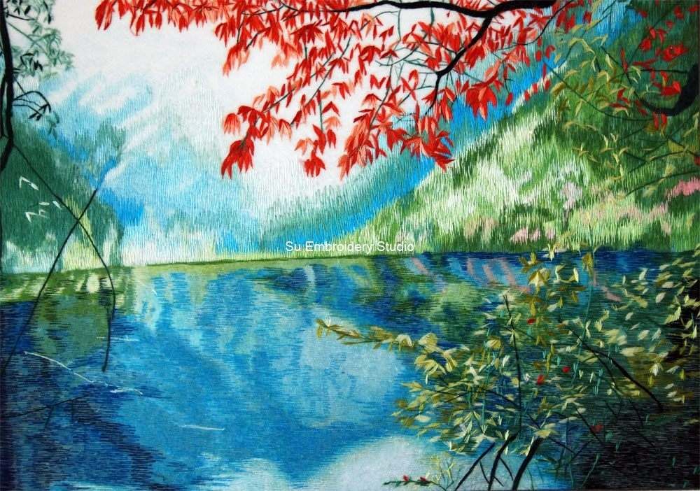 This Chinese silk embroidery features a serene and picturesque waterscape in Jiuzhaigou, Sichuan Province China. The silk embroidery artwork showcases a tranquil lake, reflecting the lush greenery and azure skies above. Trees with various shades of green leaves surround the lake, creating a natural and peaceful ambiance. The silk embroidery is intricate and detailed, capturing the textures and hues of the scene. The overall mood of the embroidery art conveyed is one of tranquility and natural beauty.