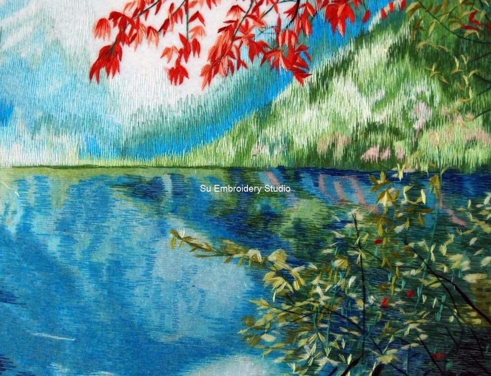 Executed with intricate silk embroidery, the details of the landscape come to life with textured stitches that capture the nuanced hues and textures of the trees, sky, and water. The careful choice of colors and skillful stitching creates a harmonious composition, evoking a sense of calmness and peaceful contemplation.