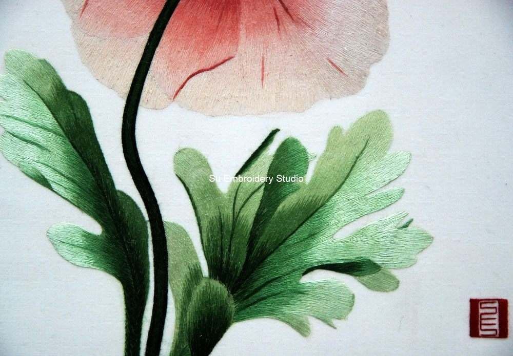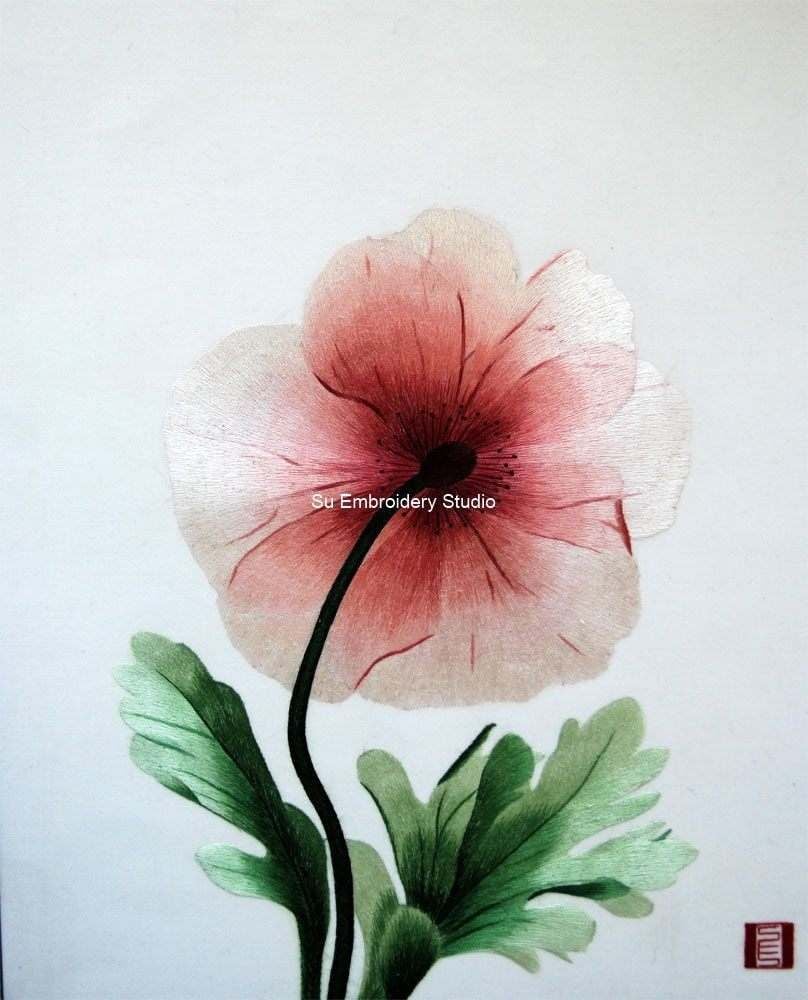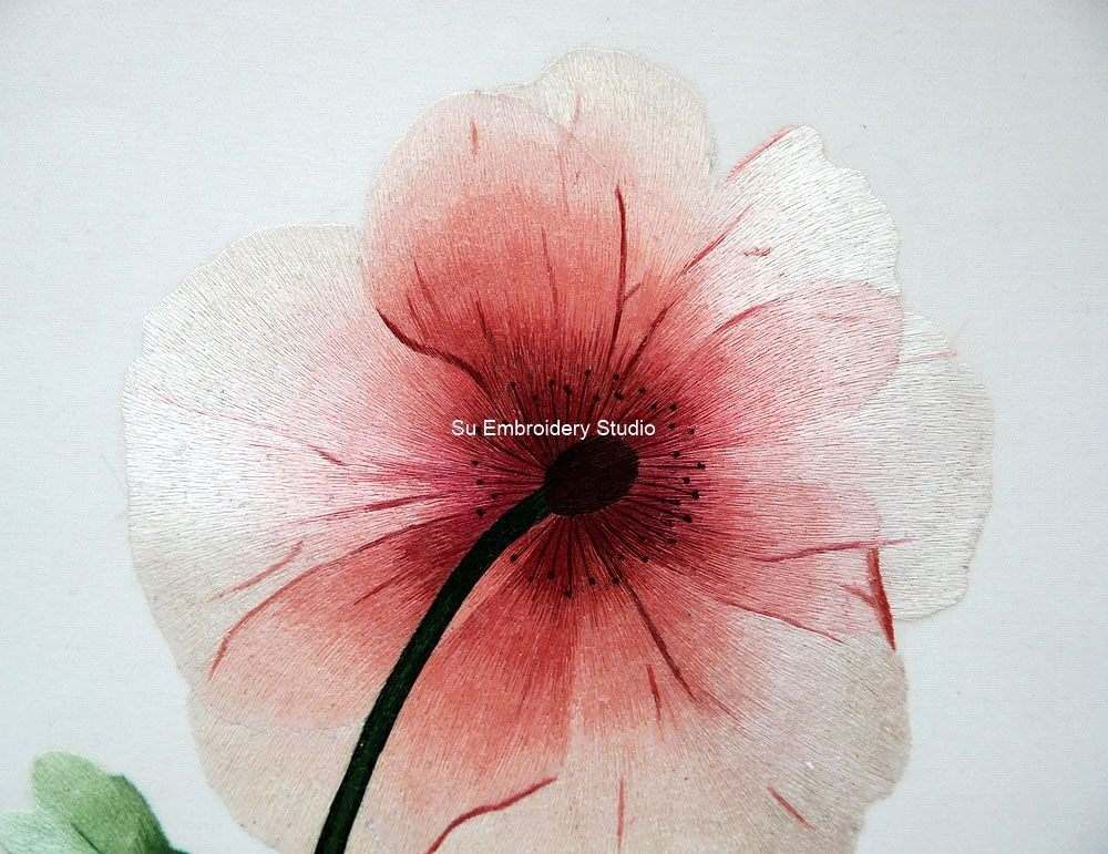 This silk embroidery painting is a beautiful piece of art that features a delicate and detailed depiction of a blooming flower, with densly hand embroidered soft pink petals that transition to a deeper hue at the center. The intricate silk stitches capture the natural texture and gradient of the flower, making it appear lifelike. The green stems and leaves are finely hand embroidered fine silk threads, showcasing the skilled craftsmanship involved in creating this artwork. It’s an elegant piece that combines traditional silk embroidery artistry with botanical beauty.