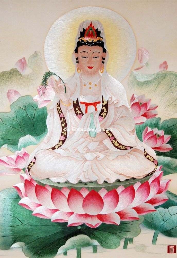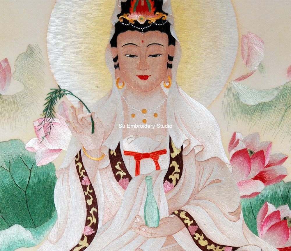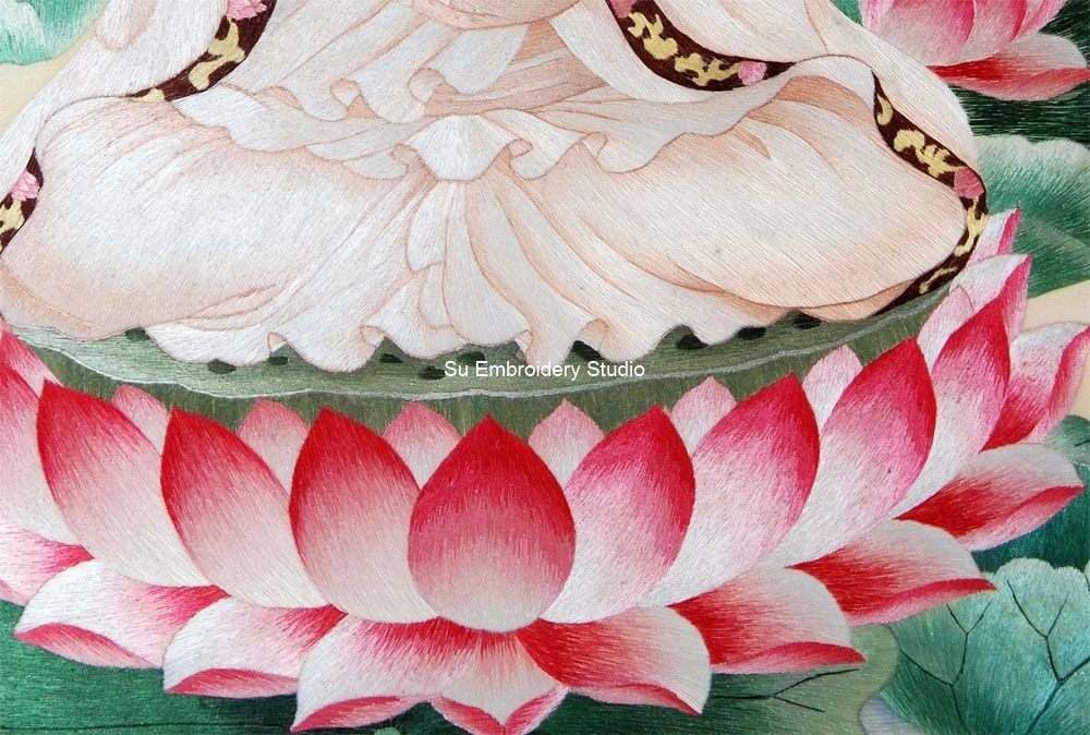 The background of the silk embroidery artwork is adorned with lush greenery and additional pink lotus flowers, creating a harmonious composition that complements the central figure. The color palette, characterized by soft yet vibrant hues, contributes to the serene ambiance of the piece, evoking a sense of tranquility and spirituality.