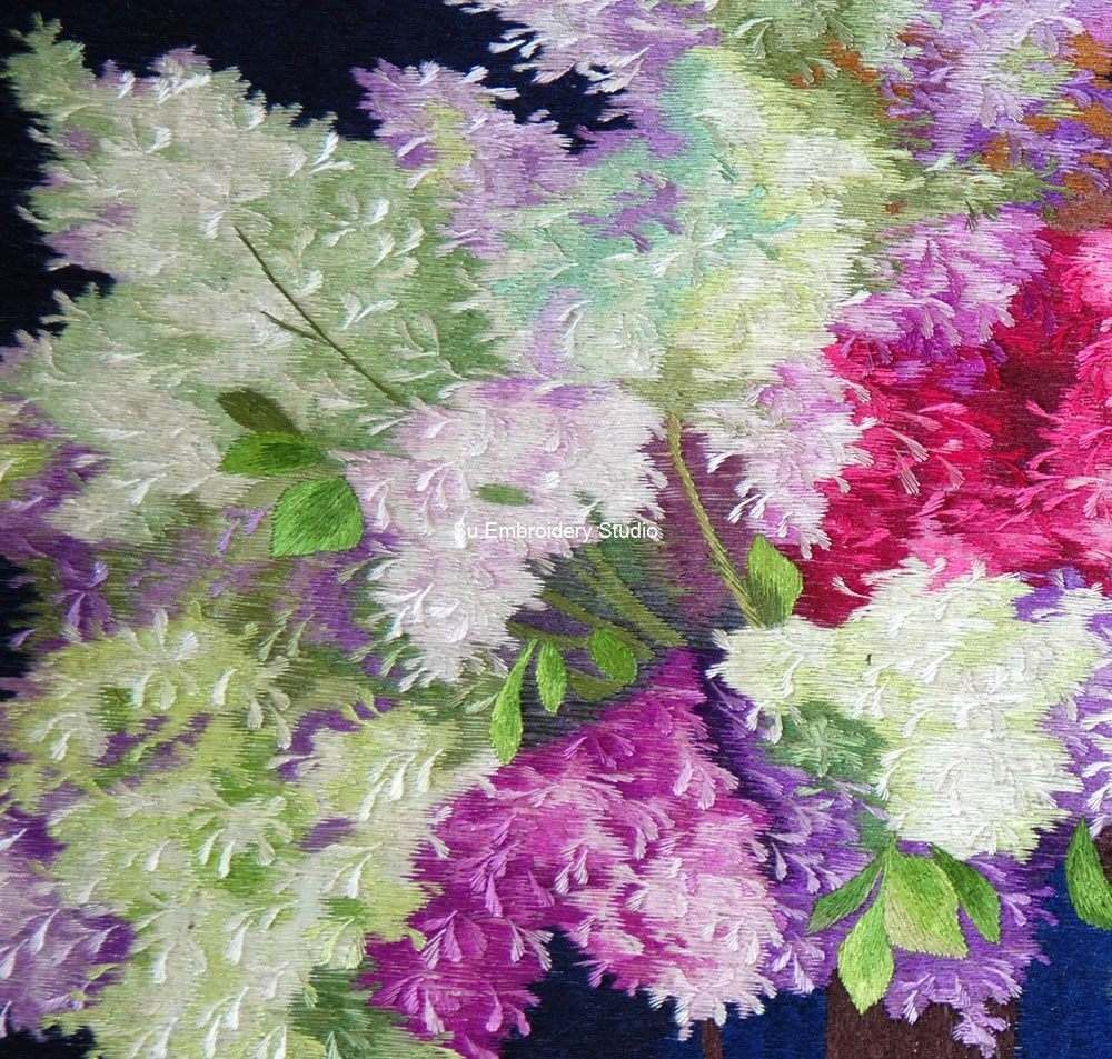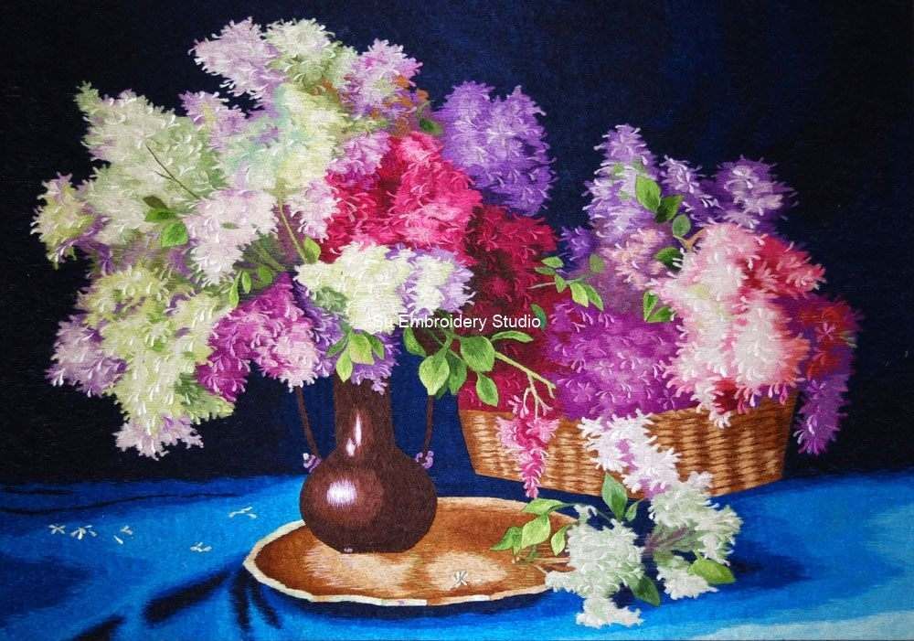 This silk thread painting is a vibrant and enchanting masterpiece, capturing the essence of nature's splendor with meticulous craftsmanship and vivid colors. The focal point of the embroidered artwork is a rich bouquet of lilacs in full bloom, showcasing a mesmerizing array of petals in varying shades of purple, pink, and white. Each flower is meticulously hand embroidered, offering a visual feast of textures and hues that bring the blossoms to life.