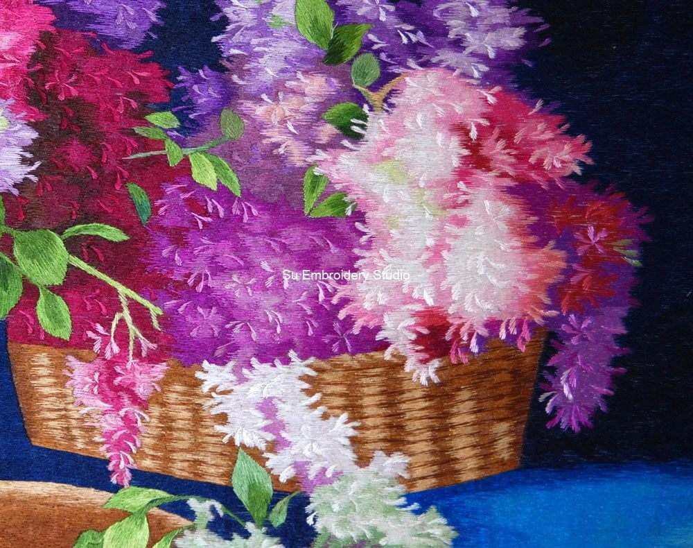 This silk embroidery is a vibrant and colorful display of purple lilac flowers, making it a perfect piece for art enthusiasts and collectors. The embroidery artwork features an array of lilacs in full bloom, with petals in varying shades of purple, pink, and white, offering a visual feast of textures and hues. The flowers are meticulously arranged in a dark brown vase and a woven basket that sits on a wooden table, all set against a deep blue backdrop that accentuates the blossoming bouquet’s natural beauty. Green leaves intersperse among the blooms, adding an element of freshness and vitality to the composition. Every stitch reflects meticulous hand embroidery craftsmanship, rendering each petal and leaf with lifelike detail. This silk embroidery painting is not just an artwork but an expression of nature’s splendor captured with needle and thread.