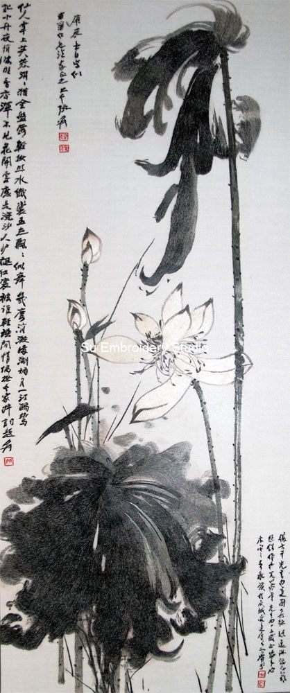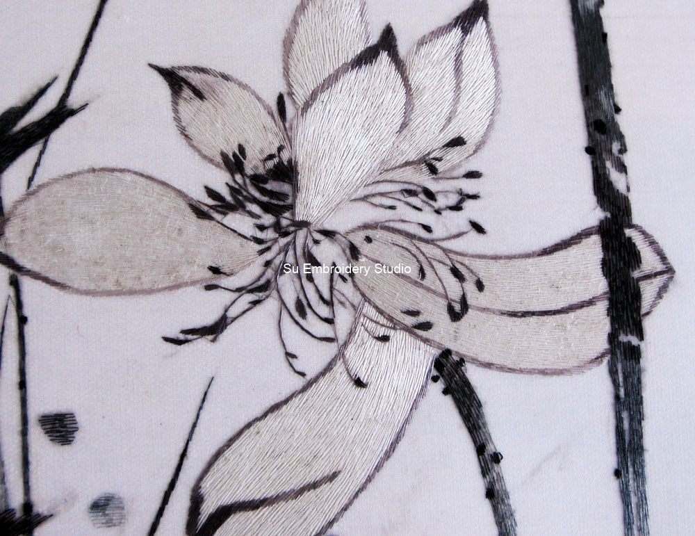 This Chinese silk embroidery is reproduced from a chinese ink painting. It is a hand embroidered by embroidery artists from Su Embroidery Studio, Suzhou, China. The embroidered painting is monochromatic, primarily using shades of black, white, and gray. A prominent lotus flower is depicted in bloom at the center of the embroidery artwork, with dark leaves and stems that contrast against the lighter background. The artwork includes intricate hand embroidery to detail the petals of the lotus flower and leaves. Chinese characters run vertically along both sides of the embroidery painting, providing poetry related to the artwork.