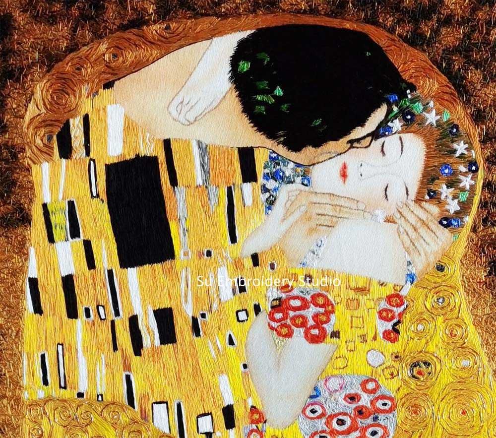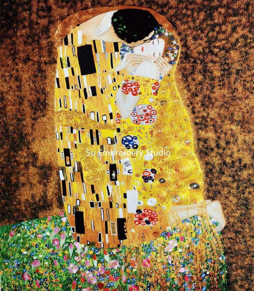 In this exquisite rendition of Gustav Klimt's "The Kiss," the enchantment of silk embroidery introduces a nuanced perspective to this cherished masterpiece. The intricate interplay of silk threads not only captures but elevates the ethereal essence of the original painting, reshaping the tactile experience of this timeless art. The golden hues, emblematic of Klimt's unmistakable style, cascade with a unique luminosity on the silk canvas, adding a mesmerizing dimension.