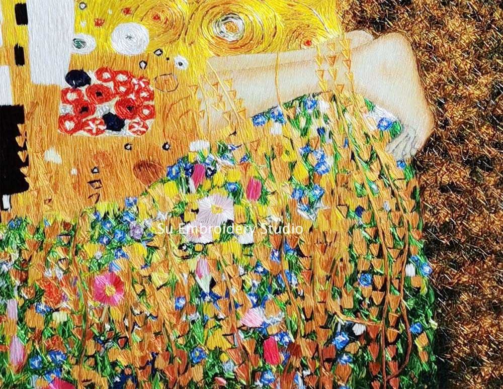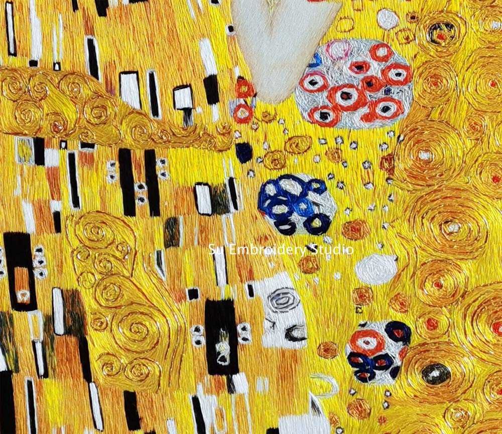 To authentically replicate Klimt's style, gold threads are seamlessly integrated, mirroring the gilded allure of the original masterpiece. Each stitch is infused with a vibrant vitality, breathing life into the silk interpretation. This silk embroidery painting not only pays a heartfelt homage to Klimt's visionary artwork but also introduces a layer of tactile richness. The silk canvas invites viewers to engage with the piece in a profoundly sensory manner, encouraging them to explore the intricate details and textures, forging a deeper connection with this exceptional interpretation.
