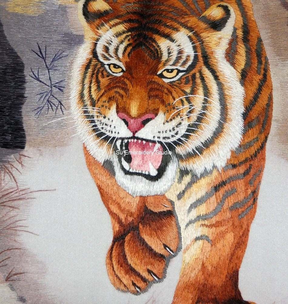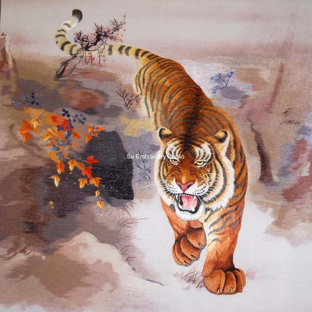 This Chinese embroidered silk is a stunning work of art that captures the majestic presence of a tiger, a symbol of power and courage, set against a serene yet vibrant natural landscape. The tiger, with its richly hand embroidered stripes and intense gaze, is portrayed mid-stride, infusing the composition with a sense of dynamic movement and energy. The meticulously crafted hand embroidery brings the tiger to life, showcasing the intricacies of its fur and the intensity of its presence.