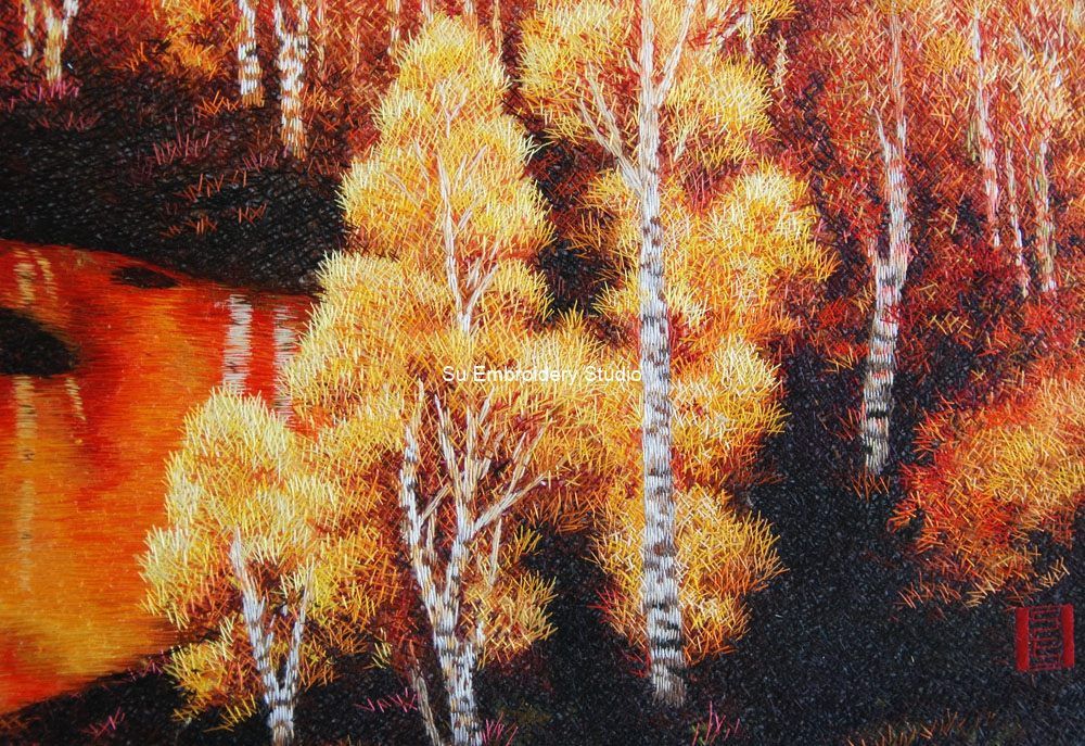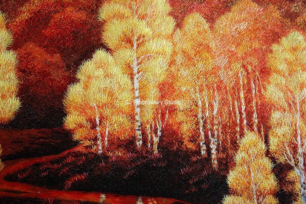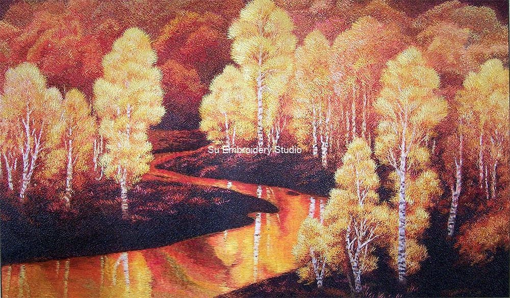 This is a silk embroidered painting that depicts a serene and beautiful autumn landscape. The image portrays an autumn scene with tall, slender trees that have golden-yellow leaves. The trees are densely populated on both sides of a winding river that reflects the warm colors of the foliage. The background is filled with more trees, creating a dense forest look, and it has a gradient of colors from dark at the bottom to lighter shades at the top, giving an impression of depth and distance. The embroidery stitches are visible and add texture to the image, making the trees and reflections on the water appear more realistic. There’s a sense of tranquility and calmness in this silk embroidery artwork; it captures the essence of fall with its warm color palette including gold, yellow, brown, and orange tones.