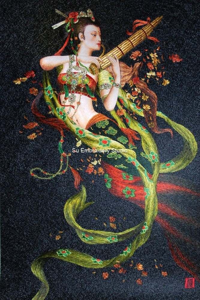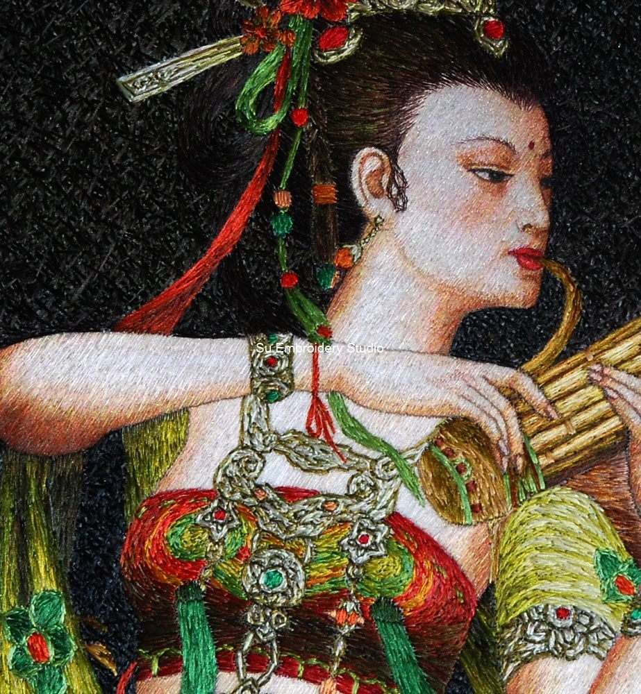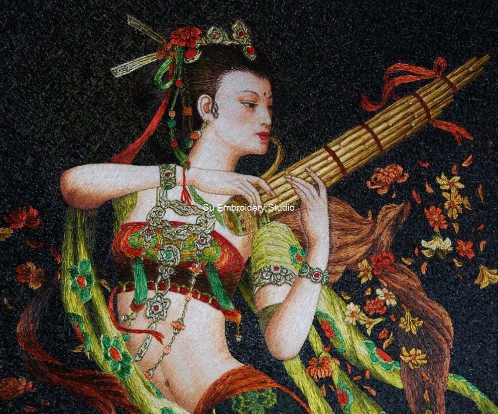 This silk embroidery painting is a beautiful and intricate depiction of a graceful Chinese lady playing the Sheng, a traditional Chinese musical instrument. The figure’s face is hand embroidered with finer silk threads than in the other parts so her skin looks smooth. The attire is adorned with intricate and colorful designs. The embroidery artwork is rich in detail and color, featuring flowing green ribbons embellished with red flowers that intertwine around the figure. The background is dark, accentuating the vibrant colors of the subject’s attire and the blossoming flowers that seem to dance around her. The whole silk embroidery painting is hand embroidered with its background solidly embroidered too. This silk embroidery embodies traditional Asian artistry, making it a perfect collectible or decorative item for enthusiasts of cultural artwork.