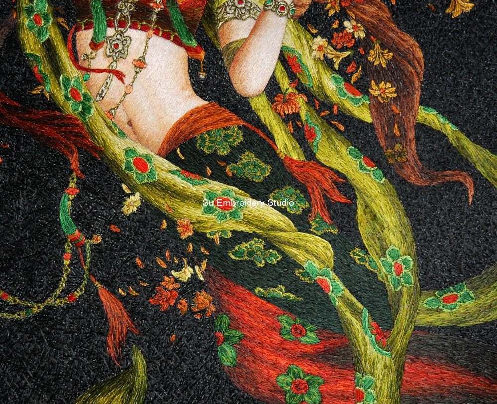 The embroidery goes beyond mere representation, as flowing green ribbons, adorned with vibrant red flowers, delicately intertwine around the figure. This dynamic element adds movement and life to the composition, creating a sense of rhythm and grace. Against a dark background, the vibrant colors of the lady's attire and the blossoming flowers stand out with striking contrast, evoking a sense of enchantment.