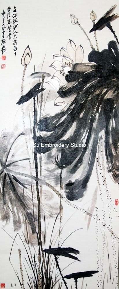 Crafted by skilled artists from Su Embroidery Studio,Suzhou, China, this silk embroidery painting employs the Su embroidery technique, which is recognized as one of the four major embroidery styles in China. The hand-embroidered nature of this piece, combined with the intricate detailing of lotus flowers, reflects the artistry and cultural richness inherent in traditional Chinese embroidery. Through the delicate use of silk threads, this artwork beautifully translates the essence of Chinese ink painting into a stunning and tactile representation of lotus blooms.