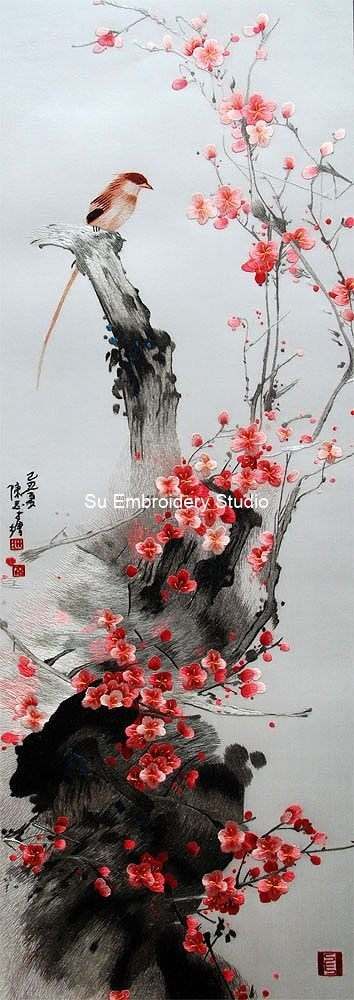 As observers engage with this silk embroidery, they are invited to appreciate the harmonious interplay between the vibrant plum / cherry blossoms and the gracefully perched bird. The careful selection of colors, the meticulous execution of stitches, and the overall composition create a visual masterpiece that resonates with the timeless beauty of nature and the artistry inherent in traditional Asian silk embroidery.