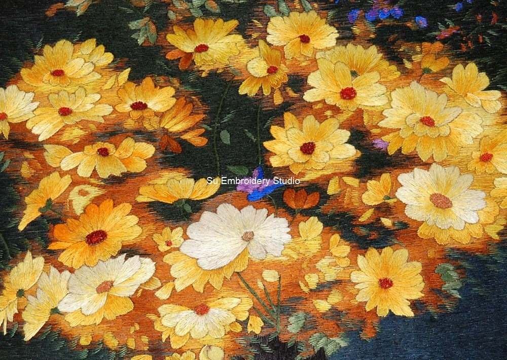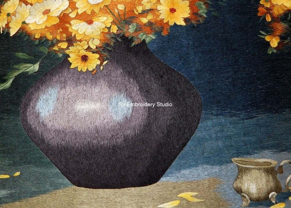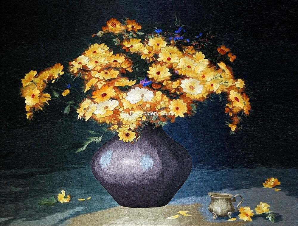 This Chinese silk embroidery features a vibrant bouquet of yellow and orange daisies, with lush green leaves, housed in a dark purple vase. The silk embroidery artwork is set against a contrasting dark background that accentuates the bright, warm colors of the flowers. The background is also hand embroidered with silk theads in short and desnse stitches. A small silver pitcher and scattered petals adorn the surface below the vase, adding depth and interest to the embroidered art. This embroidery painting would be an ideal piece for art collectors and flower enthusiasts alike. The embroidered artwork is skillfully done, and each petal and leaf is detailed, making it a true work of art. The background has soft lighting which highlights the texture of silk and enhances every detail.