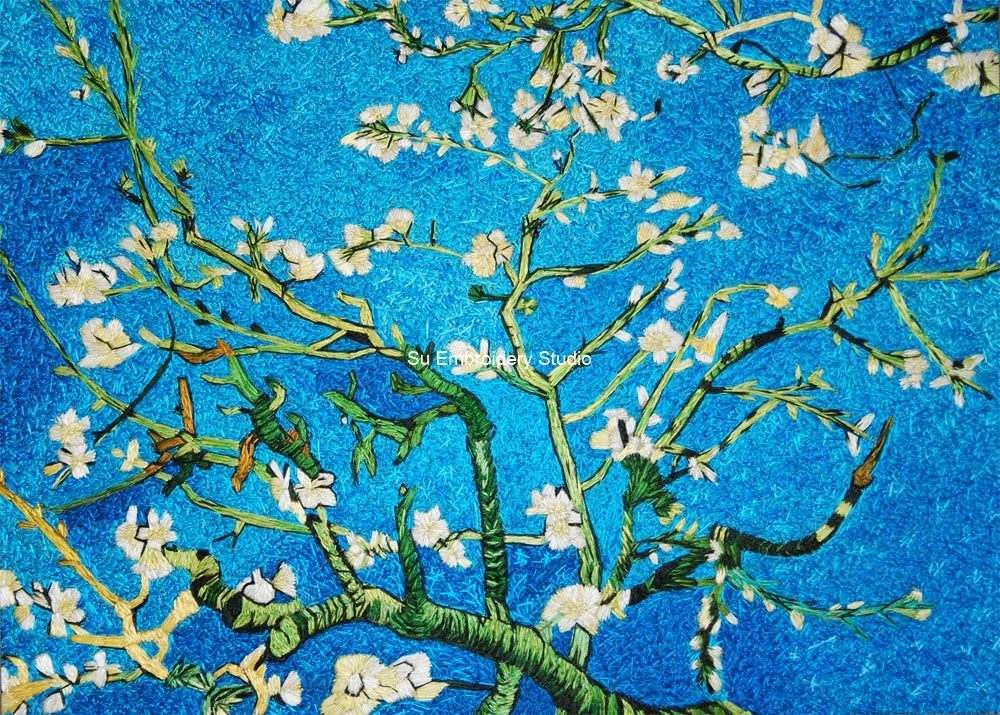 The silk embroidery reproduction skillfully captures the essence of van Gogh's Almond Blossoms, showcasing the meticulous craftsmanship of the embroiderer. Every stroke of the original artwork is translated into detailed hand embroidery stitches, capturing the swirling patterns and intricate details of the blossoms. The use of silk threads adds a luxurious sheen, enhancing the overall visual appeal.